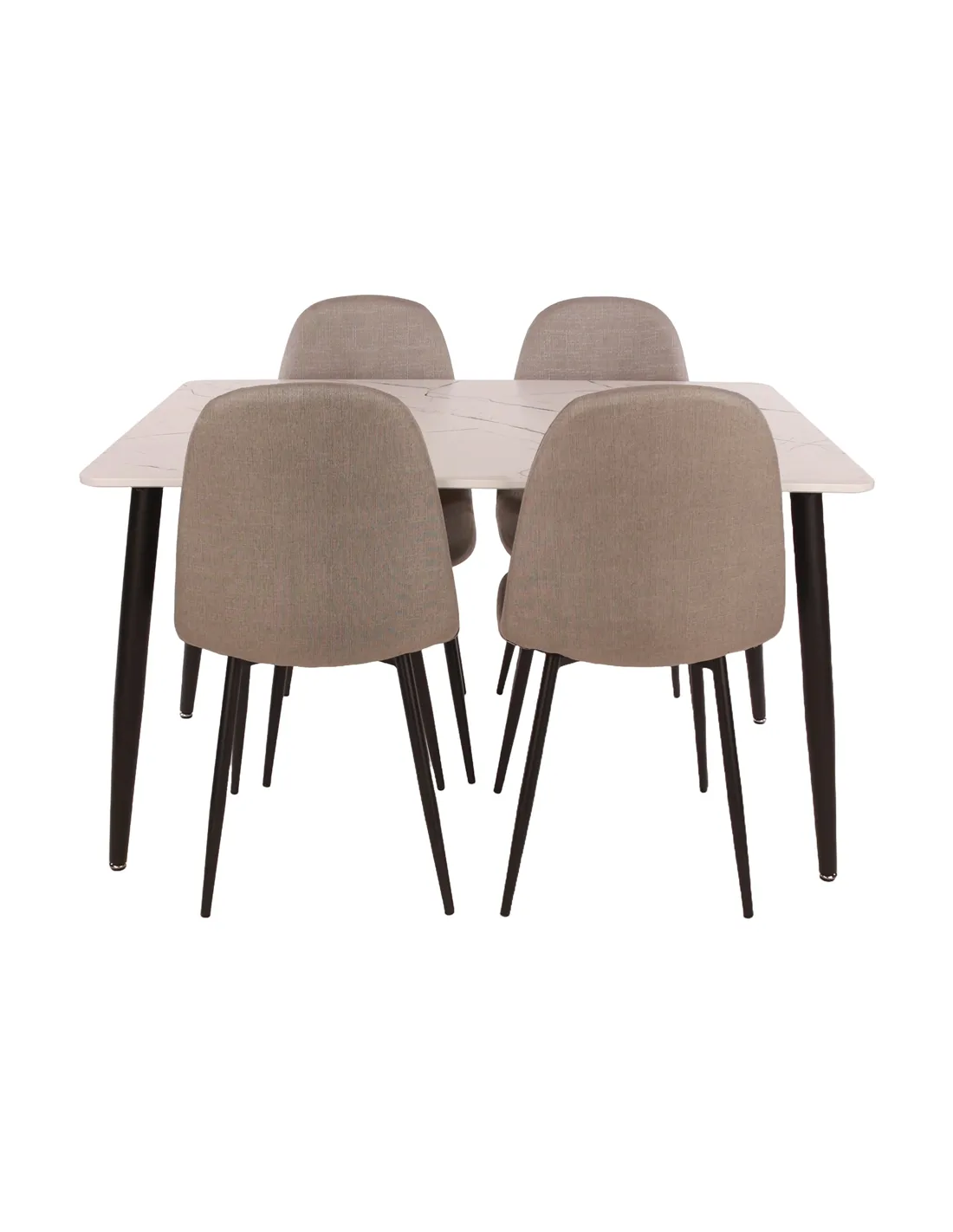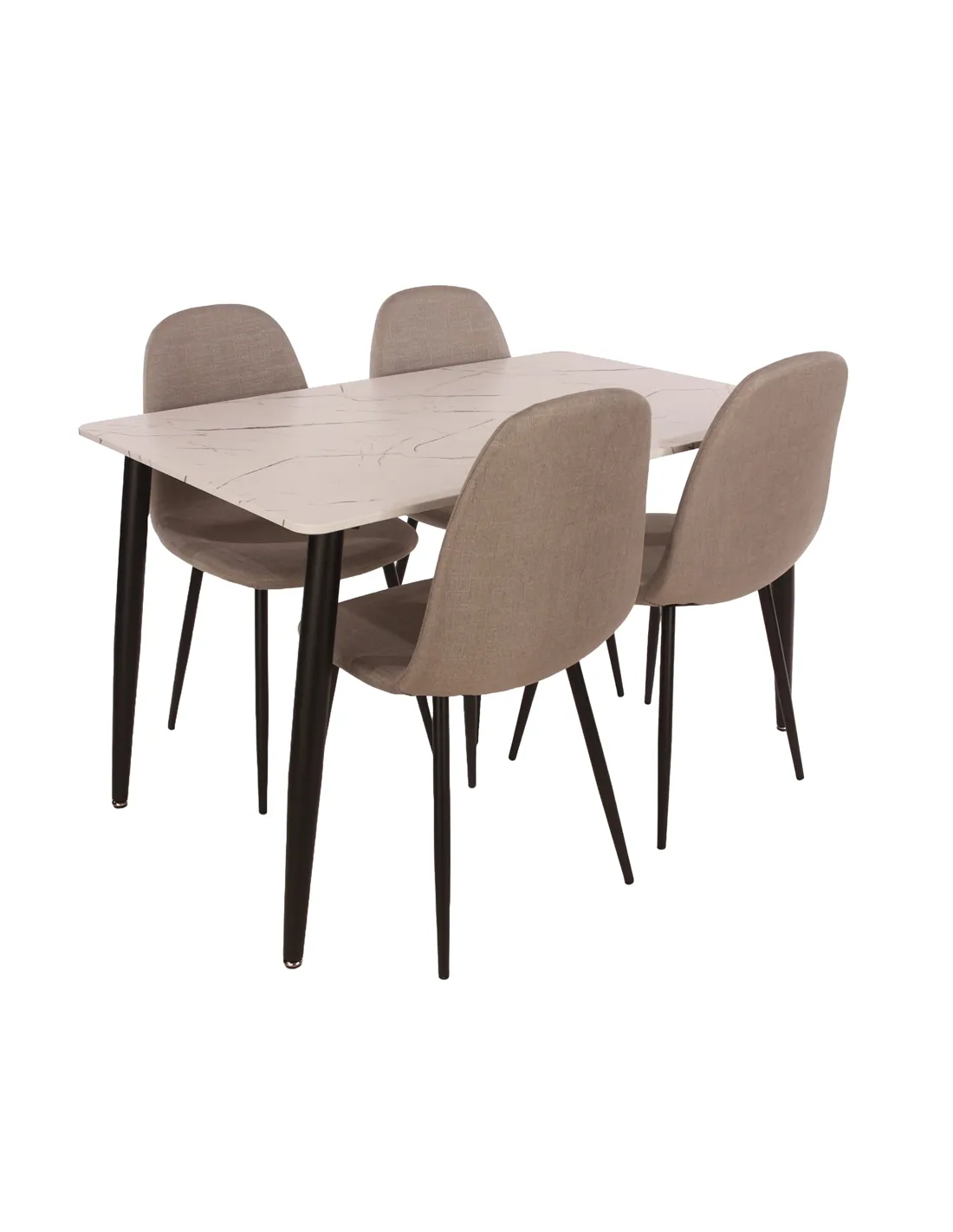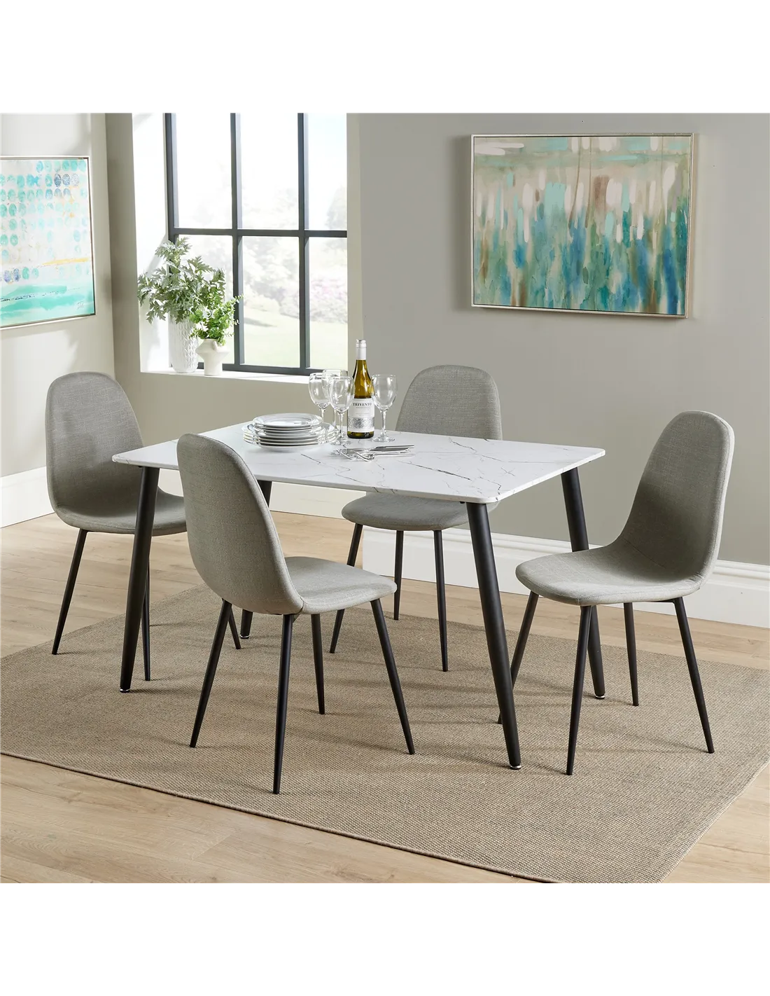 The table boasts a hardwearing white marble effect foiled top, providing a luxurious look without the hefty price tag. Its generous dimensions of 120cm x 80cm offer ample space for dining, entertaining, or simply enjoying a cup of tea. Complementing the table are four beautifully upholstered chairs in a chic stone grey fabric, each featuring sturdy metal legs for a contemporary touch.