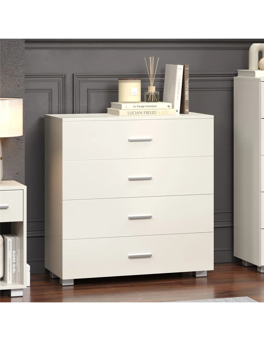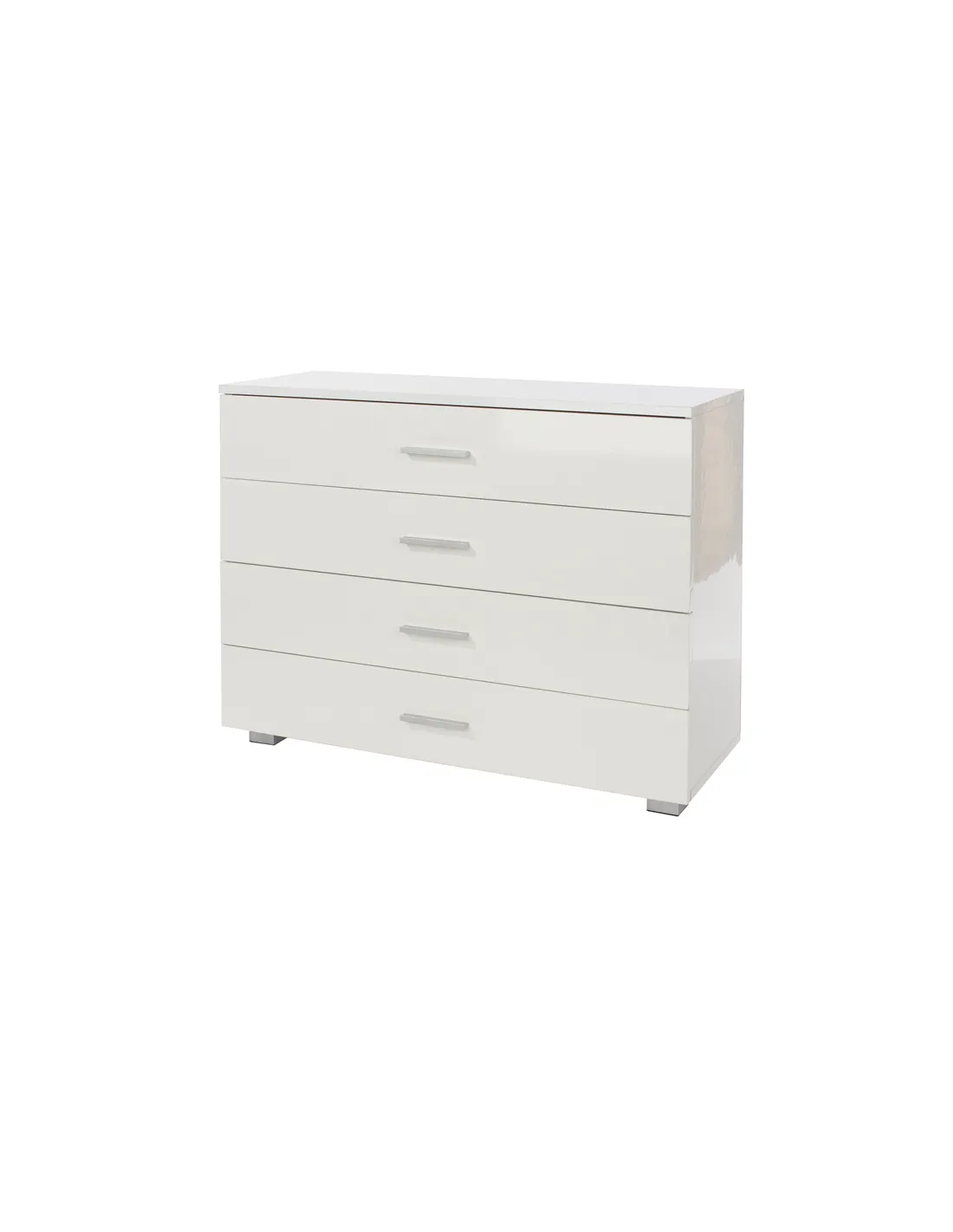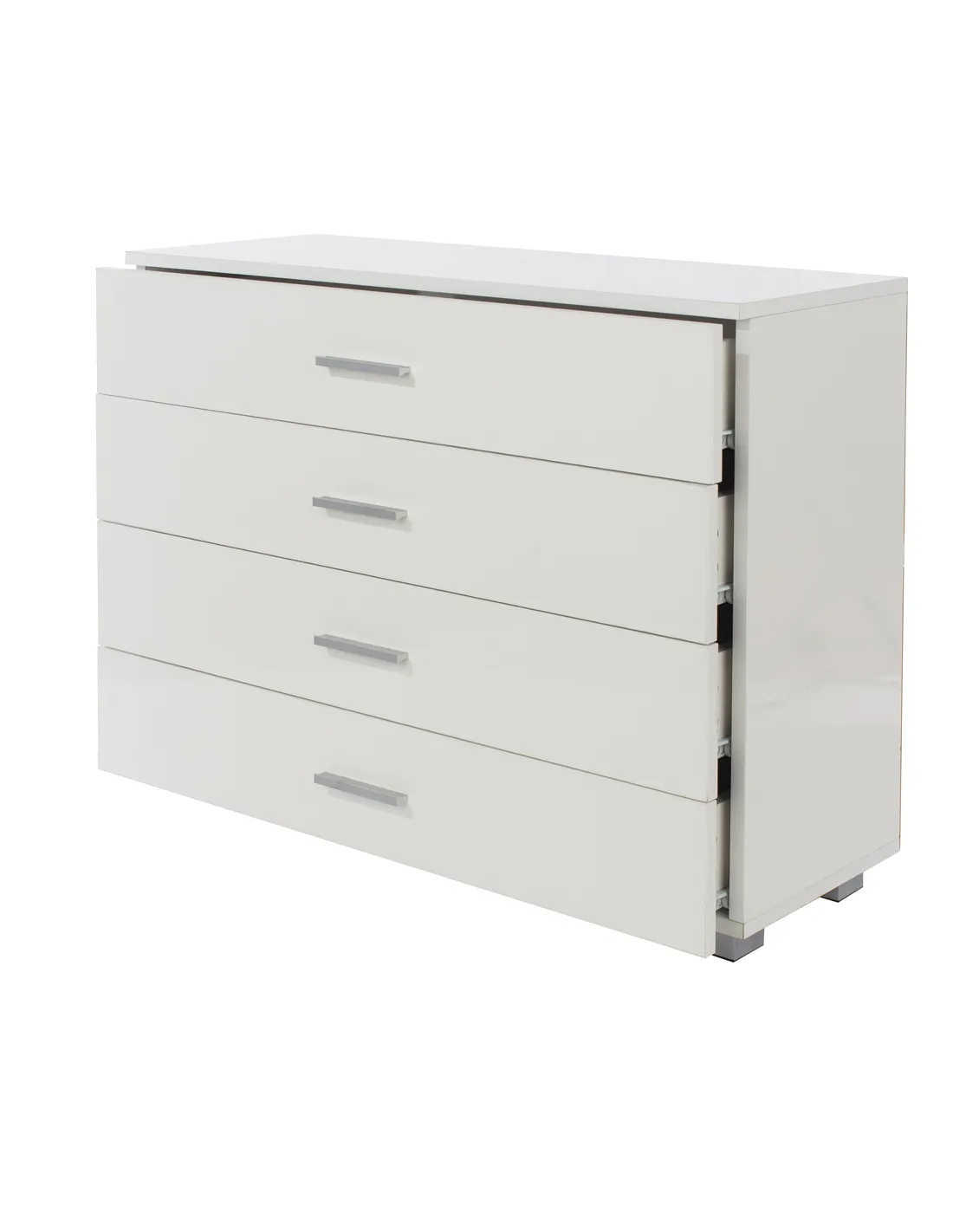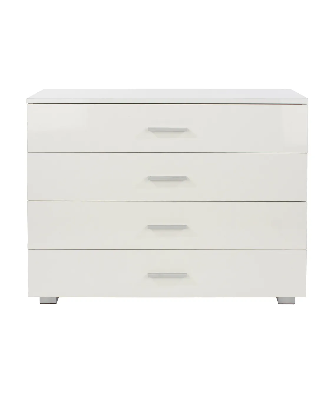 Introducing the Core Products Lido 4 Chest of Drawers, LD214 – a perfect blend of style, functionality, and affordability. This compact yet spacious chest of drawers is designed to meet your everyday storage needs while adding a touch of elegance to your home. With its sleek high gloss white finish, this piece is not only visually appealing but also incredibly durable and easy to maintain. The matt silver effect handles and feet provide a modern touch, making it a versatile addition to any room.