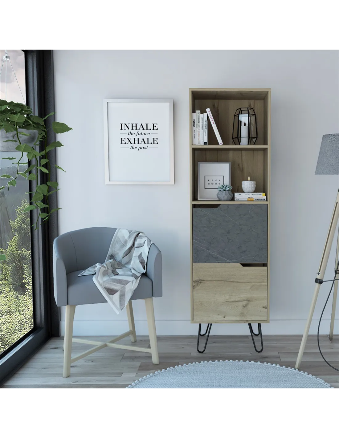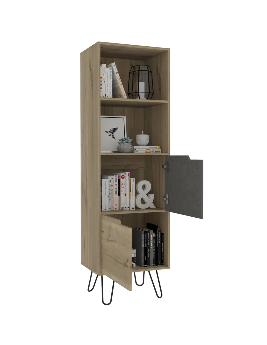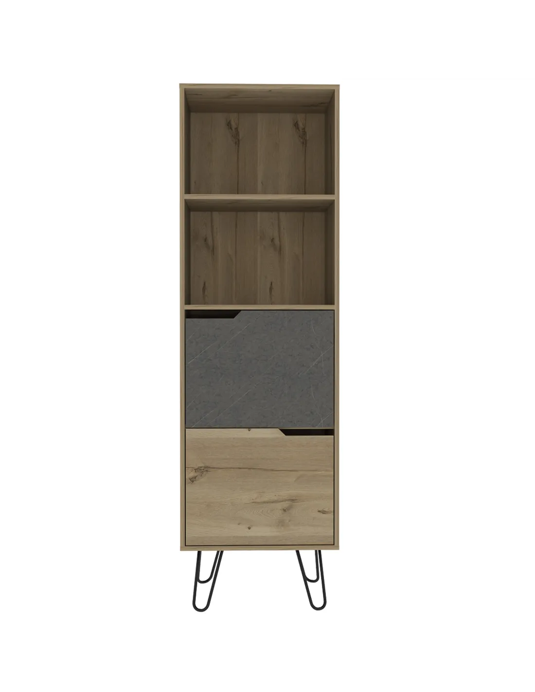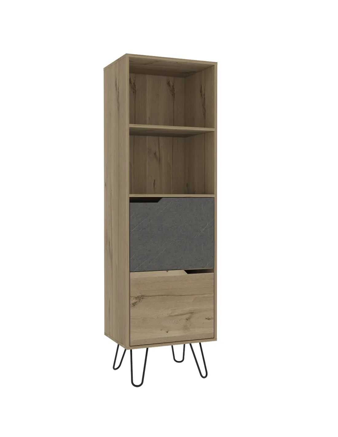 Transform your living space with the stunning Core Products Manhattan Tall Bookcase, a perfect blend of style and functionality. This exquisite piece combines open and enclosed storage, featuring a fusion of metal with a bleached pine effect, contrasting grey stone effect, and sleek black metal hairpin legs. It's the ideal solution for those seeking a modern yet practical storage option.