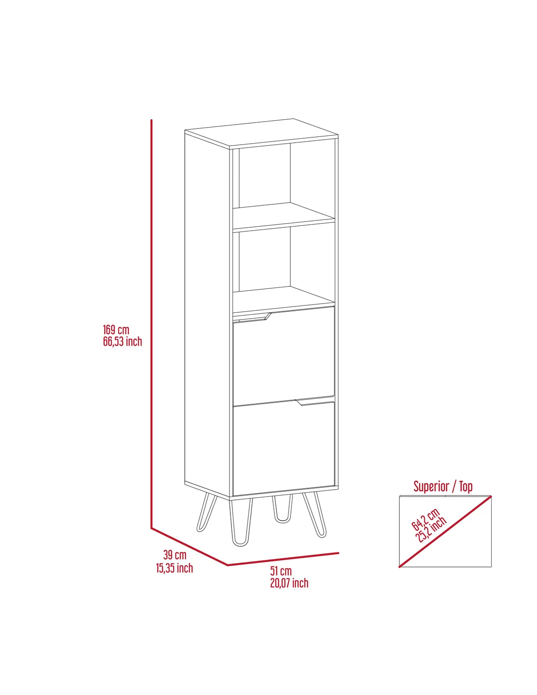 - Height between top and upper middle shelf: 335mm