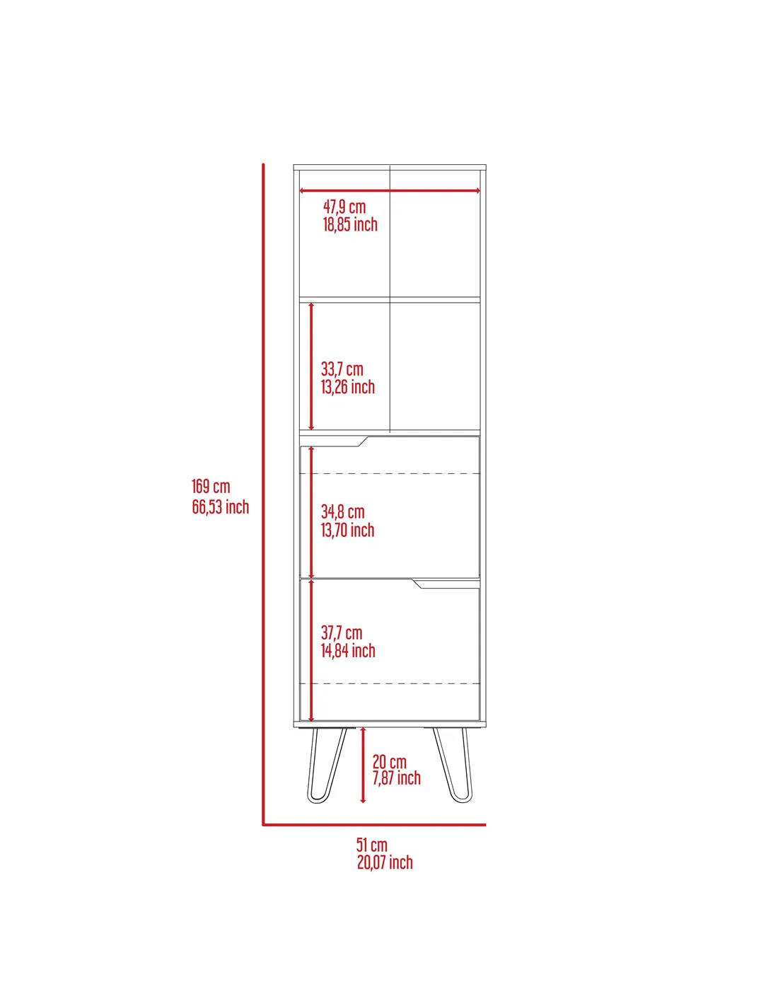- Height between middle and lower middle shelf: 448mm