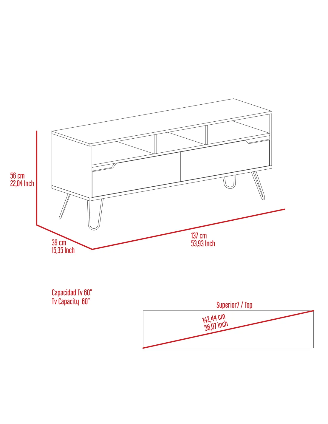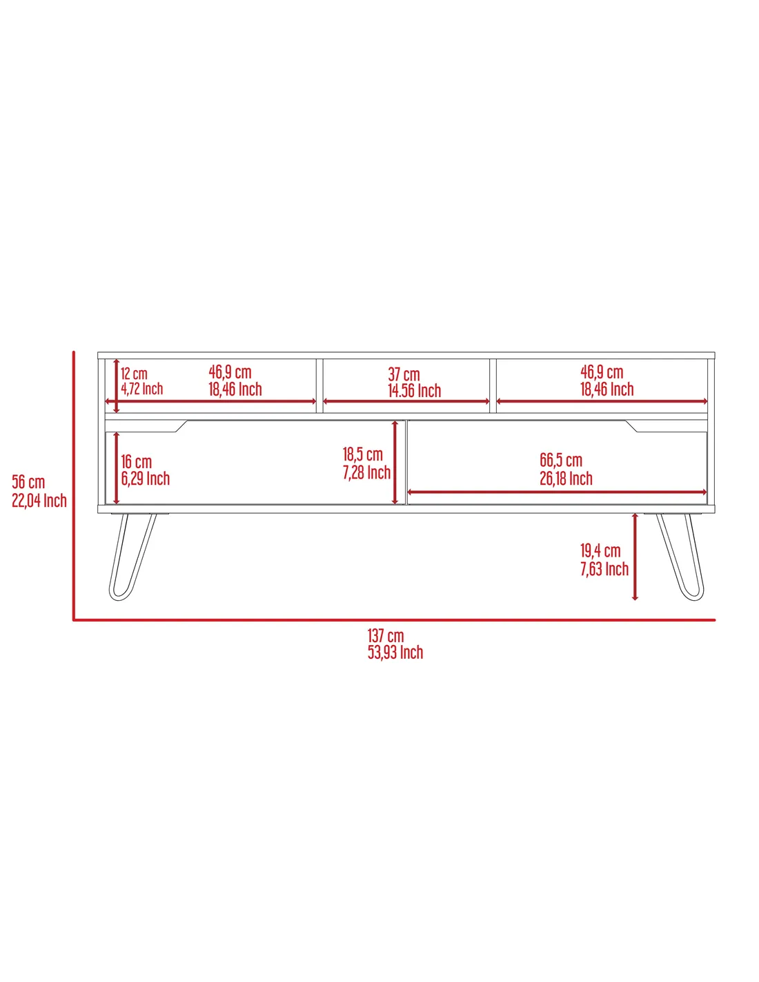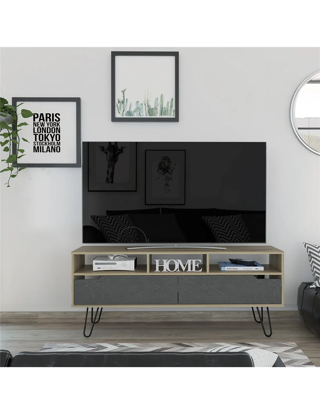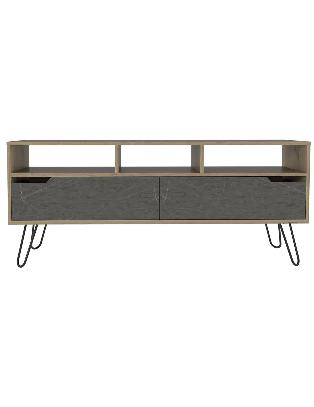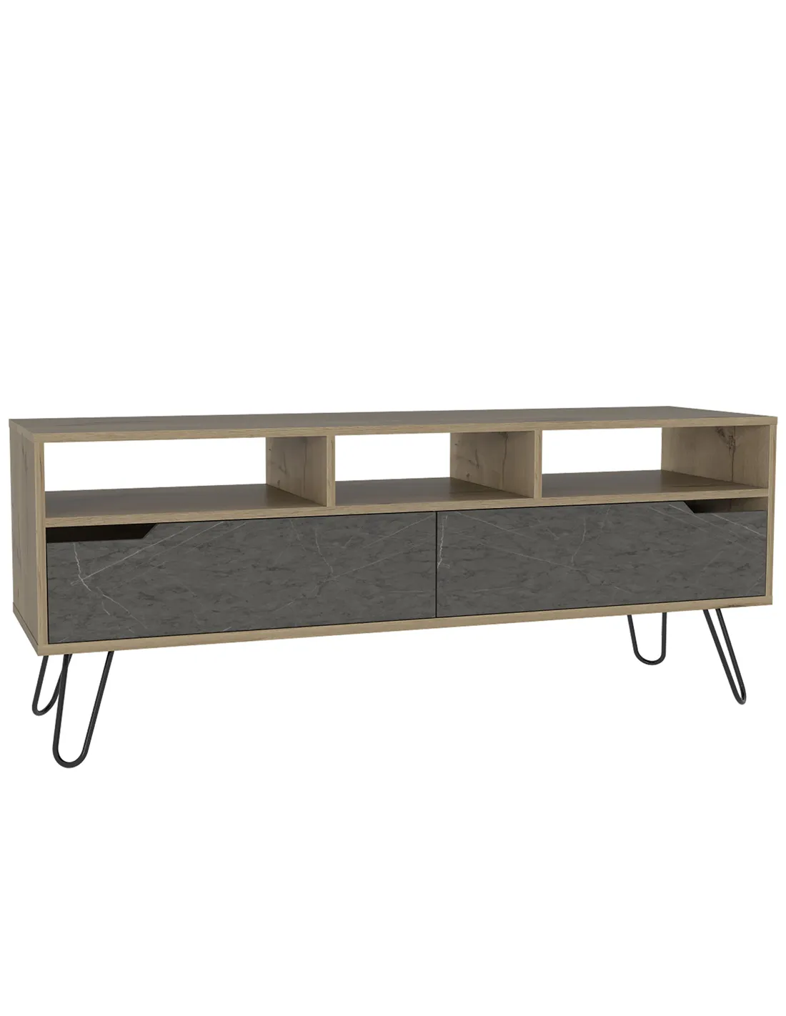 Transform your living space with the Core Products Manhattan Wide Screen TV Rack, MN912, a perfect blend of style and functionality. This stunning TV unit is designed to accommodate screens up to 56 inches, offering ample open space for your gadgets and additional storage concealed behind three drop-down doors. Finished in a chic bleached pine and grey stone effect, this piece is not only visually appealing but also easy to maintain, thanks to its durable melamine surface. The real metal hairpin legs add a touch of industrial elegance, making it a standout addition to any room.