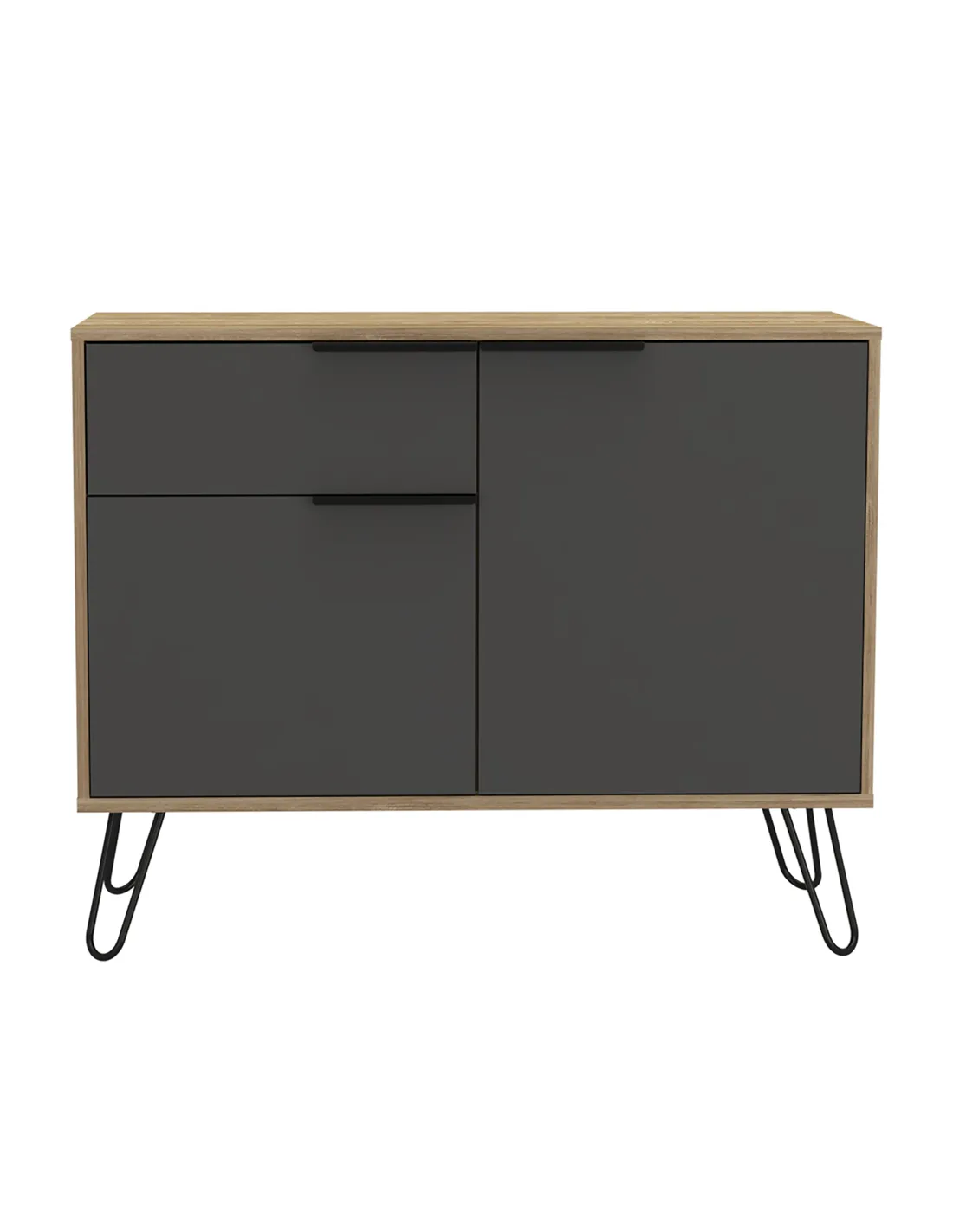 Introducing the Core Products Vegas Small Sideboard, a stunning blend of style and functionality that will instantly elevate your living space. This compact yet spacious sideboard is designed to meet all your storage needs while adding a touch of elegance to your home. Crafted with a bleached Oak effect and a contrasting matt grey finish, it features sleek black pull handles and trendy hairpin-shaped legs, making it a perfect fit for any modern interior.