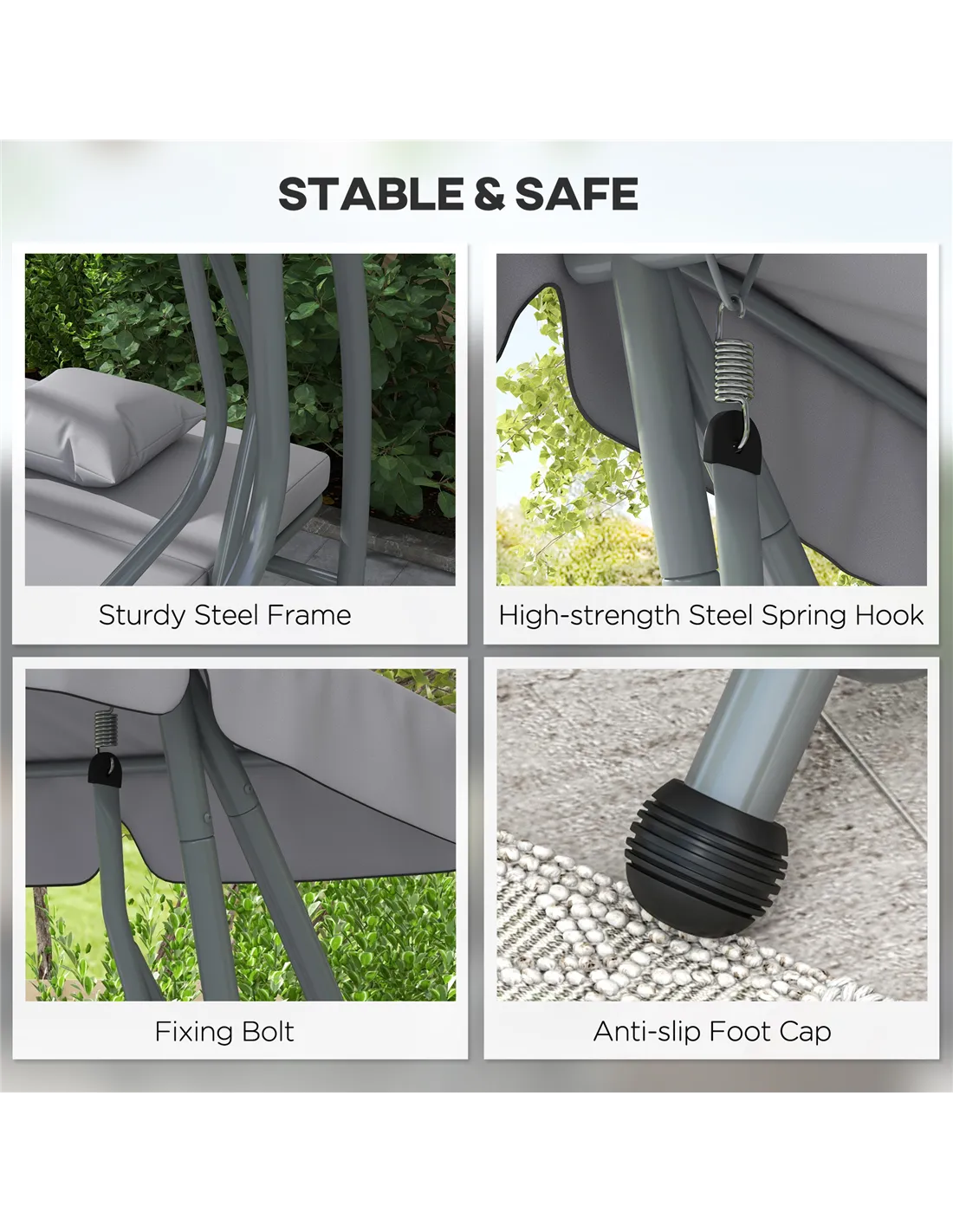 The Outsunny garden swing bench seamlessly fits any garden, balcony, or porch. Constructed from powder-coated steel, its tiltable backrest transforms the frame into a cosy sun lounger. Equipped with an adjustable-angle polyester canopy, it ensures a shaded area is always available.
