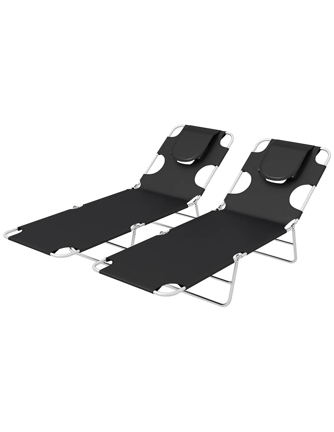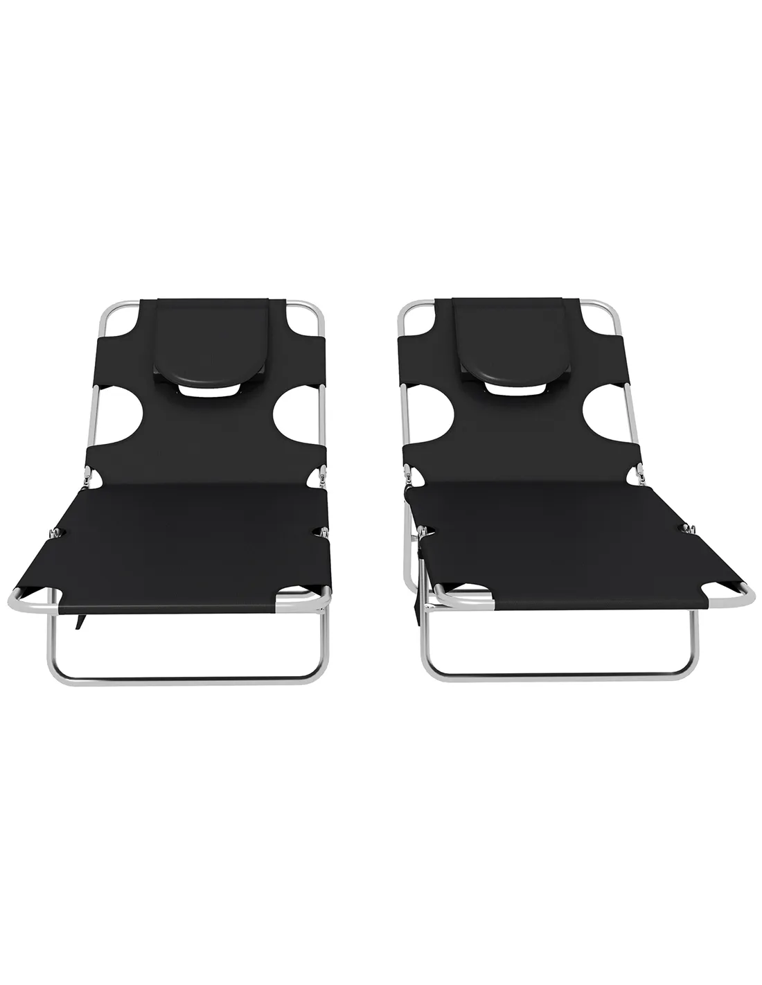 Outsunny Foldable Sun Lounger Set of 2, Beach Chaise Lounges with Reading Hole, Arm Slots, 5-Position Adjustable Backrest, Side Pocket, Pillow for Patio, Garden, Beach, Pool, Black