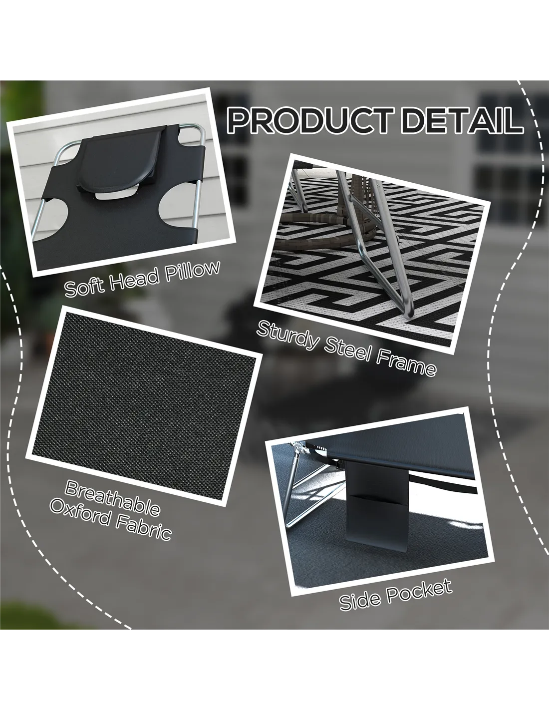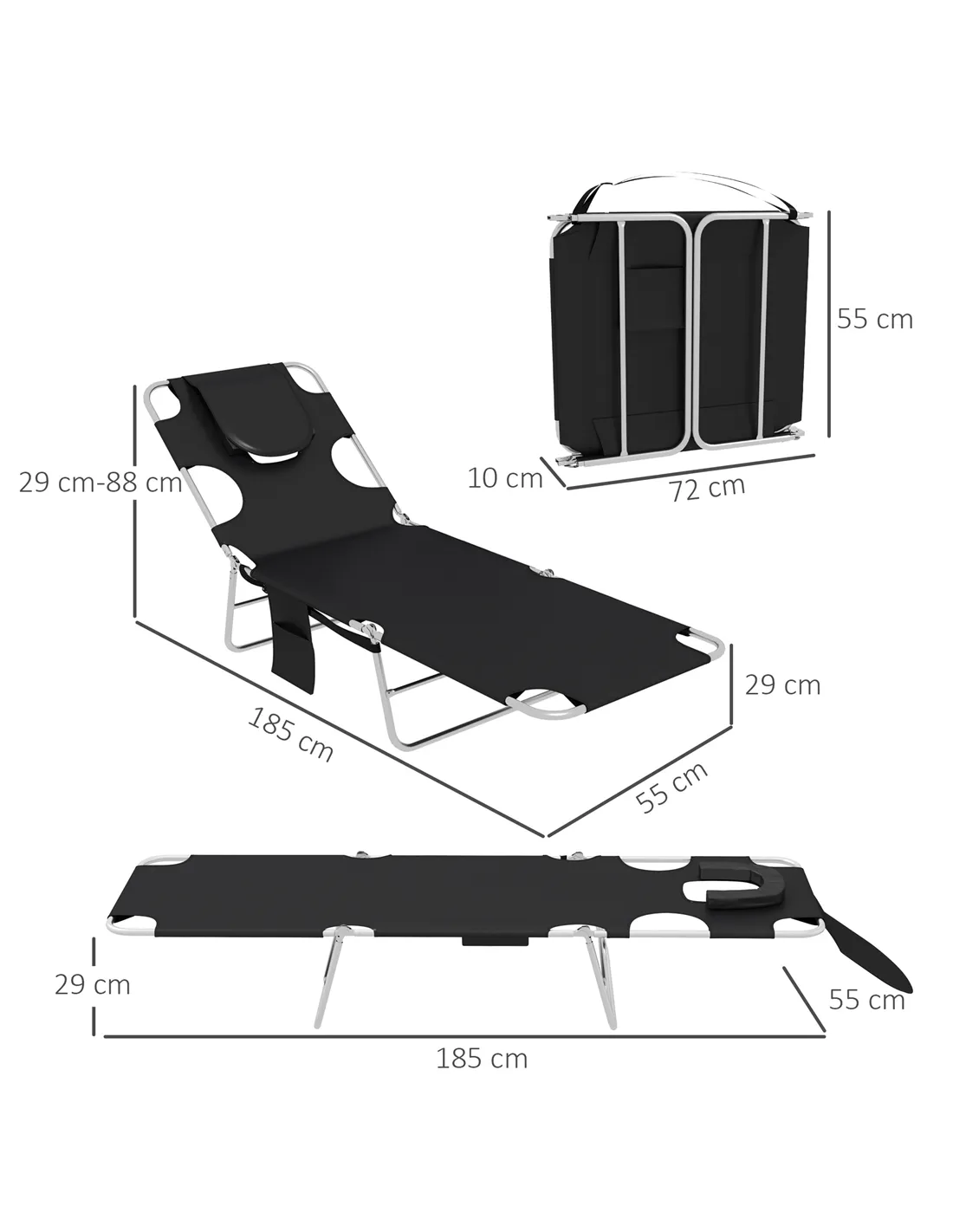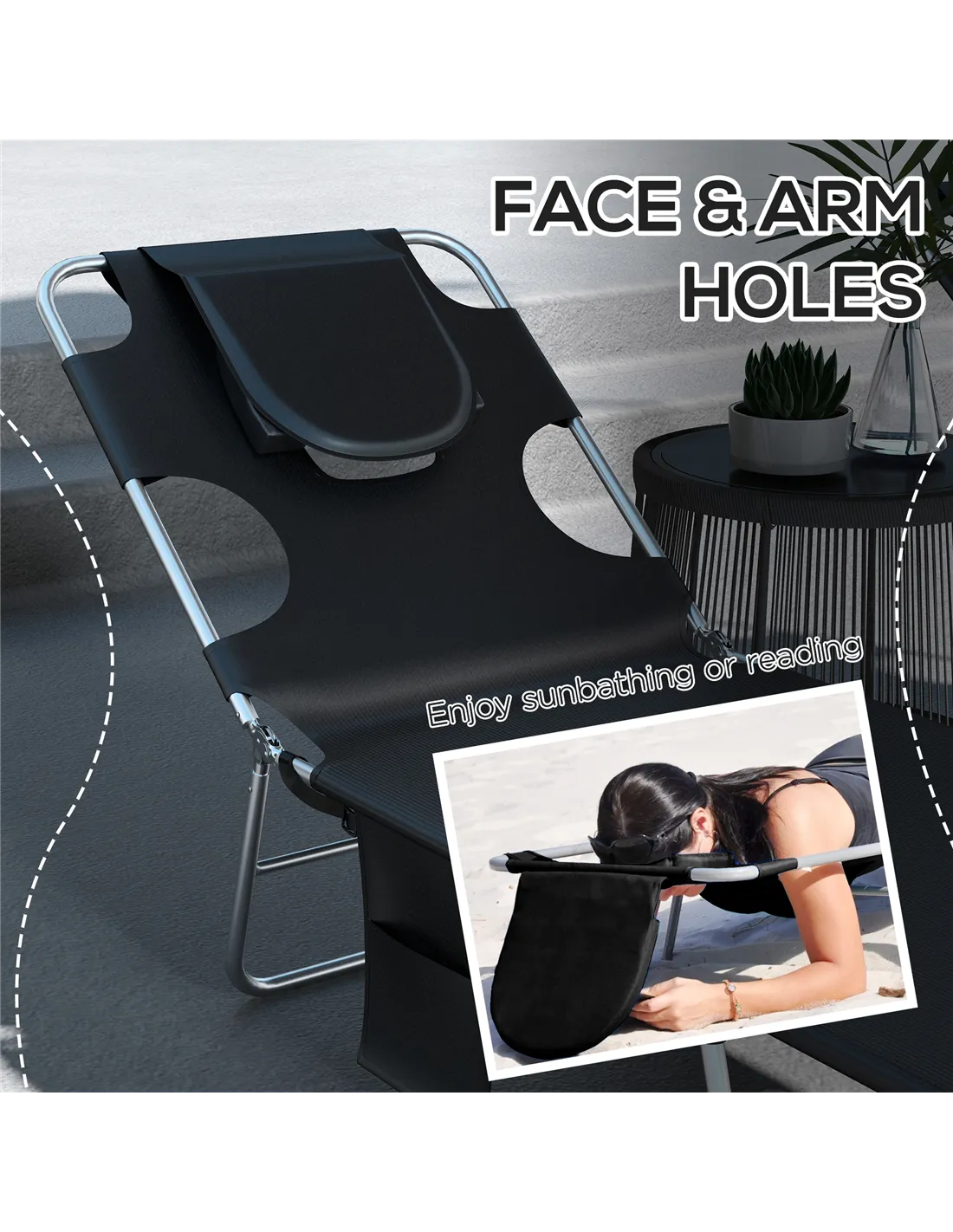 A cool update on the foldable sun loungers from Outsunny. Features a padded head hole at the front to allows you to rest your face in comfortably, which is perfect for relaxing or even reading a book! The powder coated steel frame is strong and solid to support up to 120 kg. The reclining backrest is five positions adjustable, easy to set and lock to a position you like best. Complete with a handy side pocket.