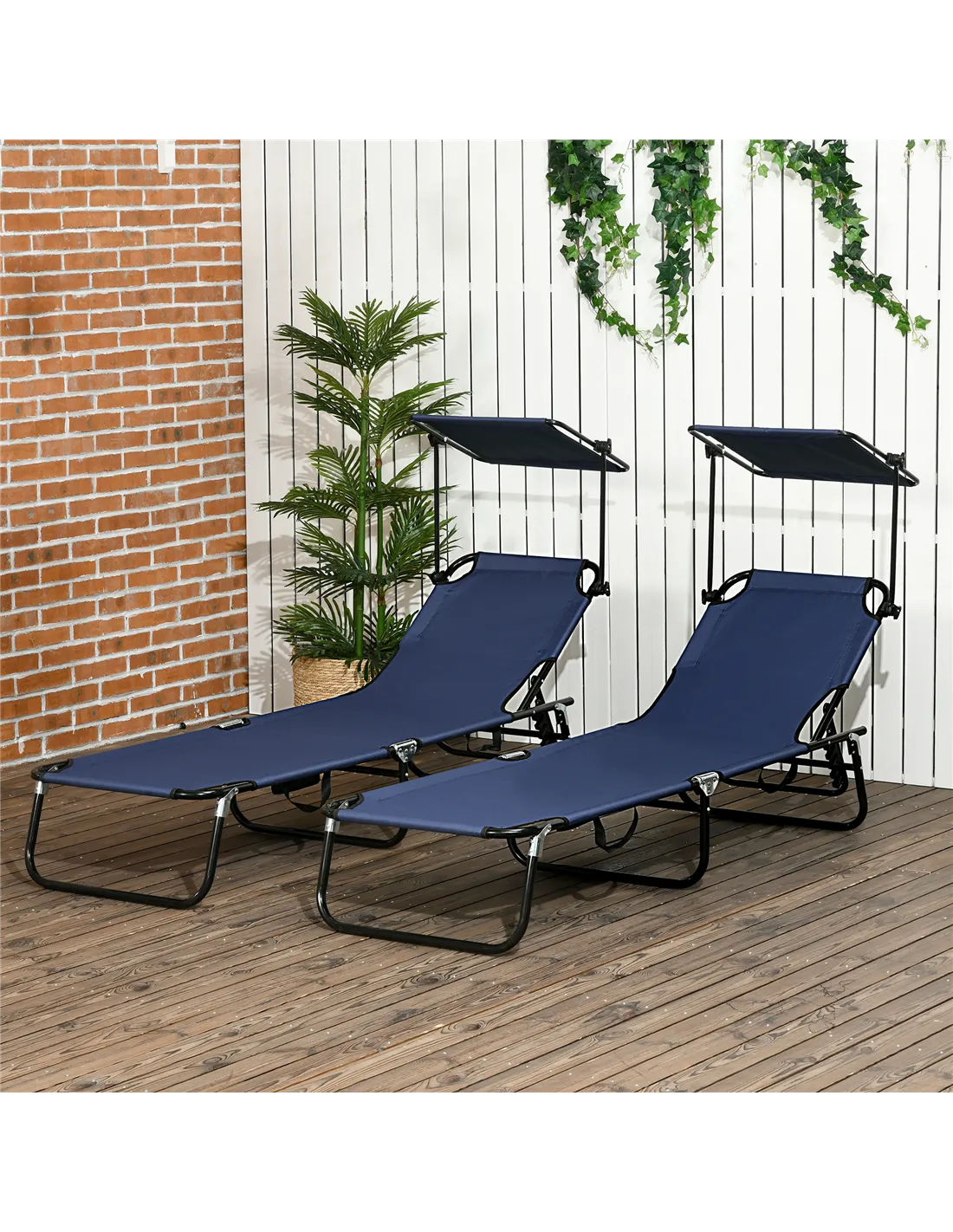 This set of two Outsunny sun loungers means you and a friend can sunbathe outdoors in comfort. Both feature reclining backs - set between the five positions; a sunshade roof - pick the angle you like most. Powder coated steel frames for a strong and supportive core; the folding garden sun loungers can be folded to carry and store easily.