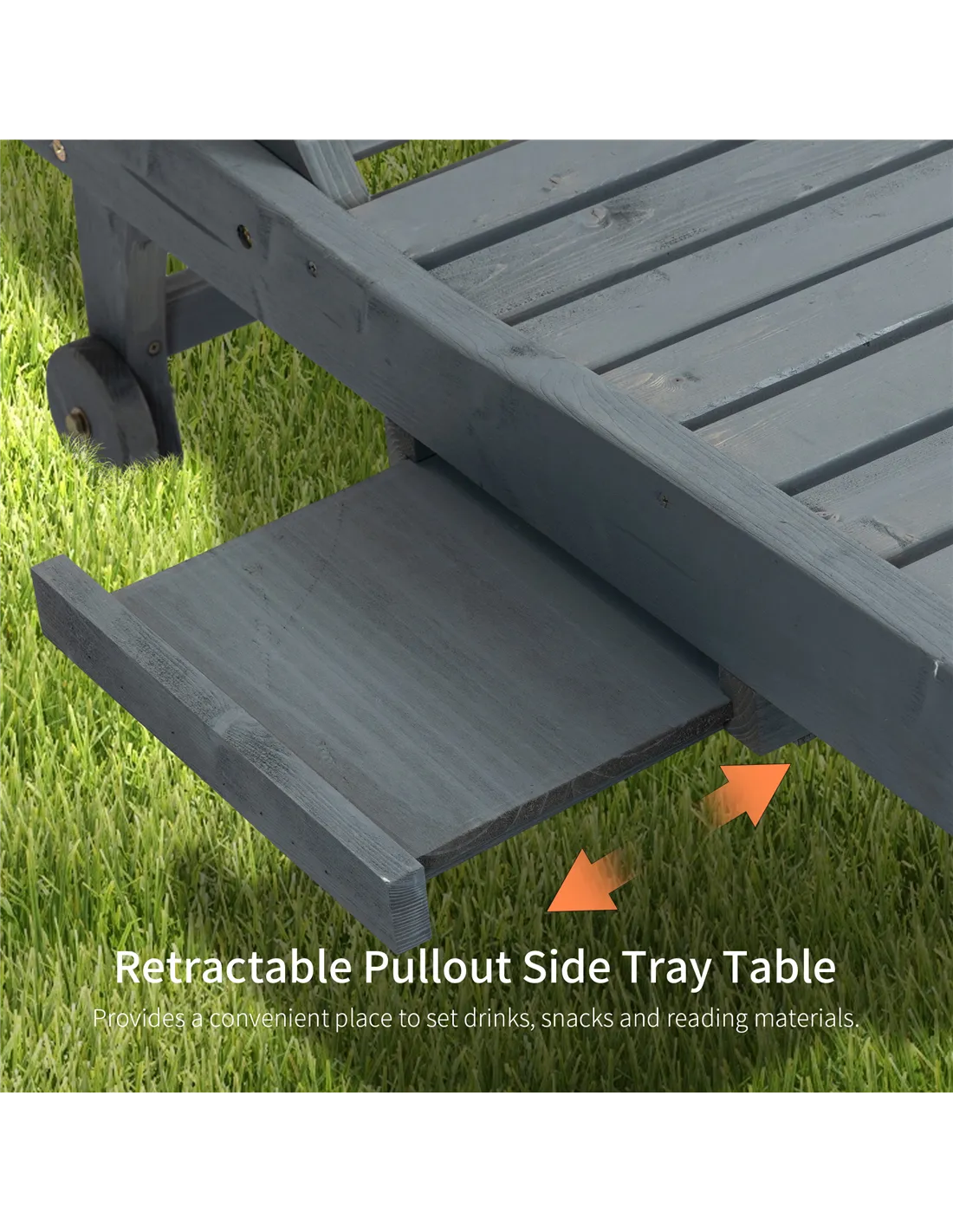Outsunny Garden Patio Sun Lounger, Outdoor Wooden Sun Bed with Built-In Table, Reclining Backrest and Rolling Wheels for Sunbathing, Grey
