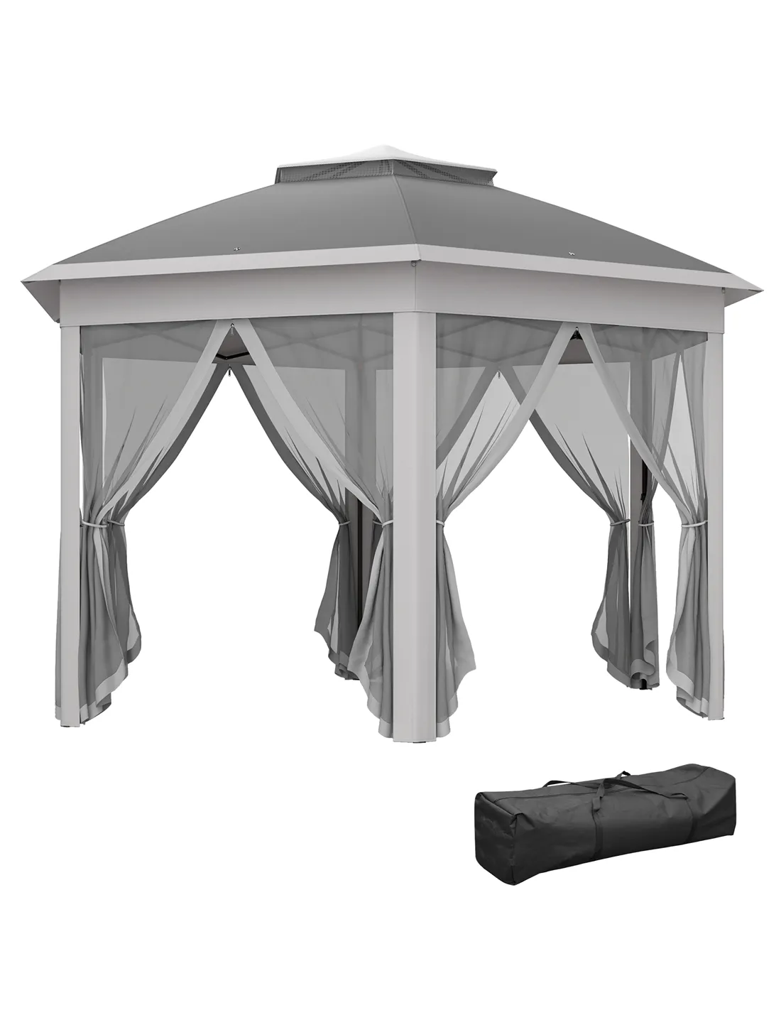 Outsunny 3 x 4m Garden Gazebo Hexagon Pop Up Gazebo Party Tent Canopy Double Roof Instant Shelter with Netting and Carry Bag for Outdoor Patio, Dark Grey