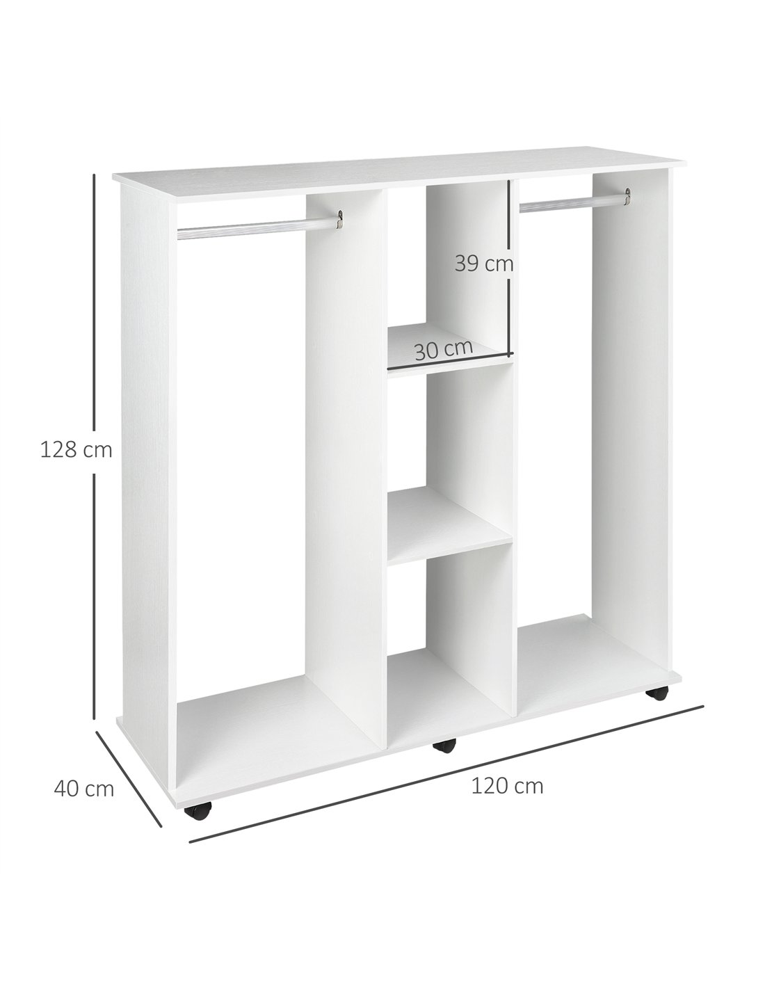 The HOMCOM open wardrobe with double mobile storage and six wheels is a versatile addition to any British home. Ideal for bedrooms, dressing rooms, or guest rooms, it offers practical storage with two hanging rails perfect for coats, dresses, or shirts, while the central three-tier cube shelving neatly accommodates folded clothes, shoes, or accessories. Thanks to its smooth-rolling omni-directional wheels, it can be effortlessly moved to suit your space or cleaning needs, with two lockable wheels ensuring stability when stationary. Its sleek white finish complements modern interiors, making it suitable for compact flats or spacious homes alike. Customers have found it especially useful as a temporary wardrobe solution during room renovations or as an extra organiser in shared living spaces.