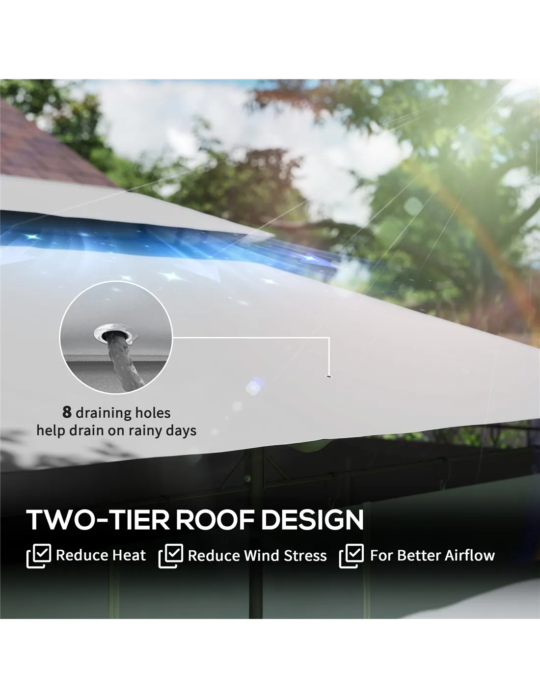 - Two-tier roof on garden canopy gazebo for gentle airflow. Eight grommet holes for rainwater