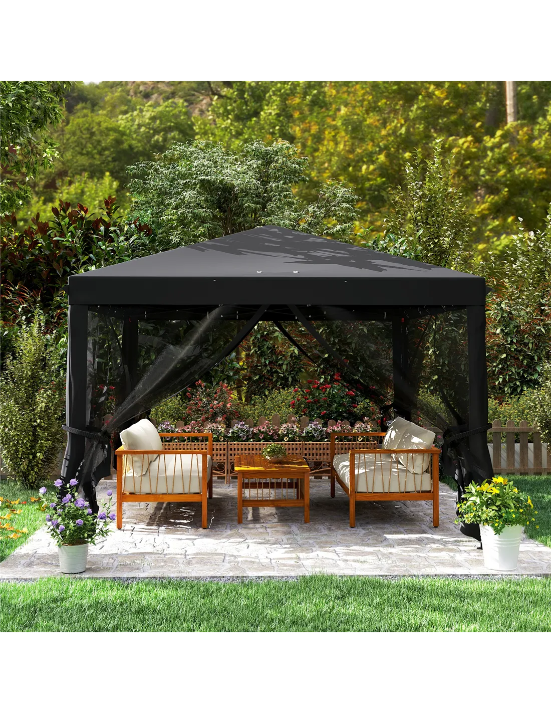 A handy shelter for your outdoor gatherings, assembled oh so quickly - bring this Outsunny 3 x 3(m) pop up gazebo with sides to your garden, this season and beyond. The three-level adjustable metal frame means a strong core, which can set to a height most suitable for you. Comes with removable mesh curtains - create a private and open feel easily. Bag included to store and carry easily.