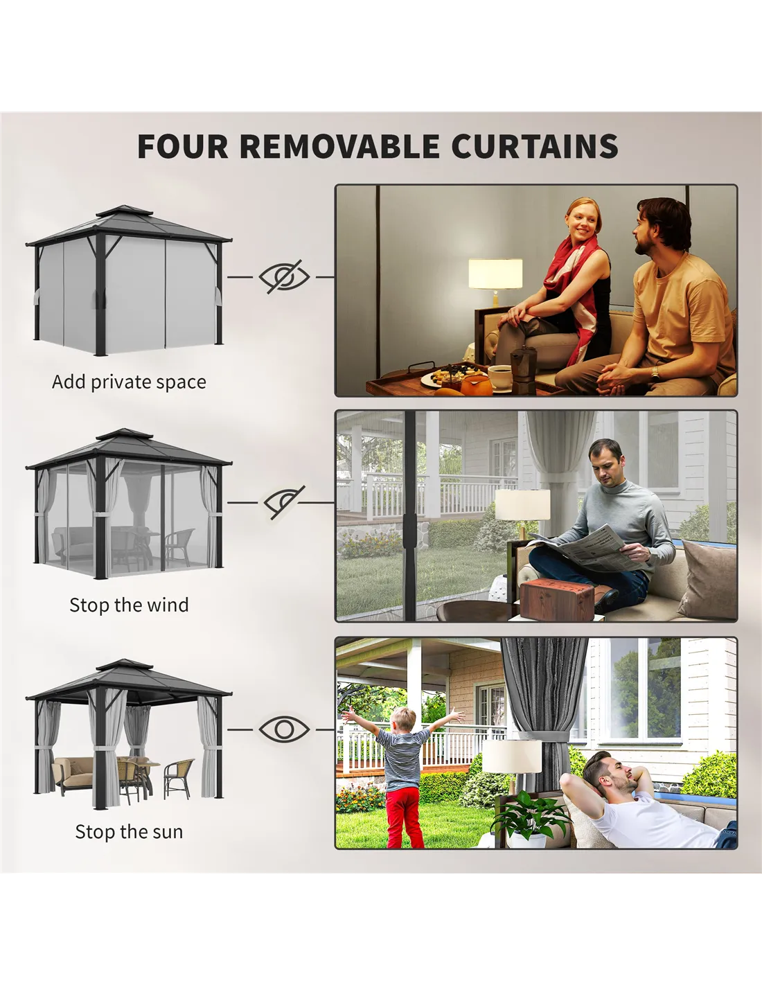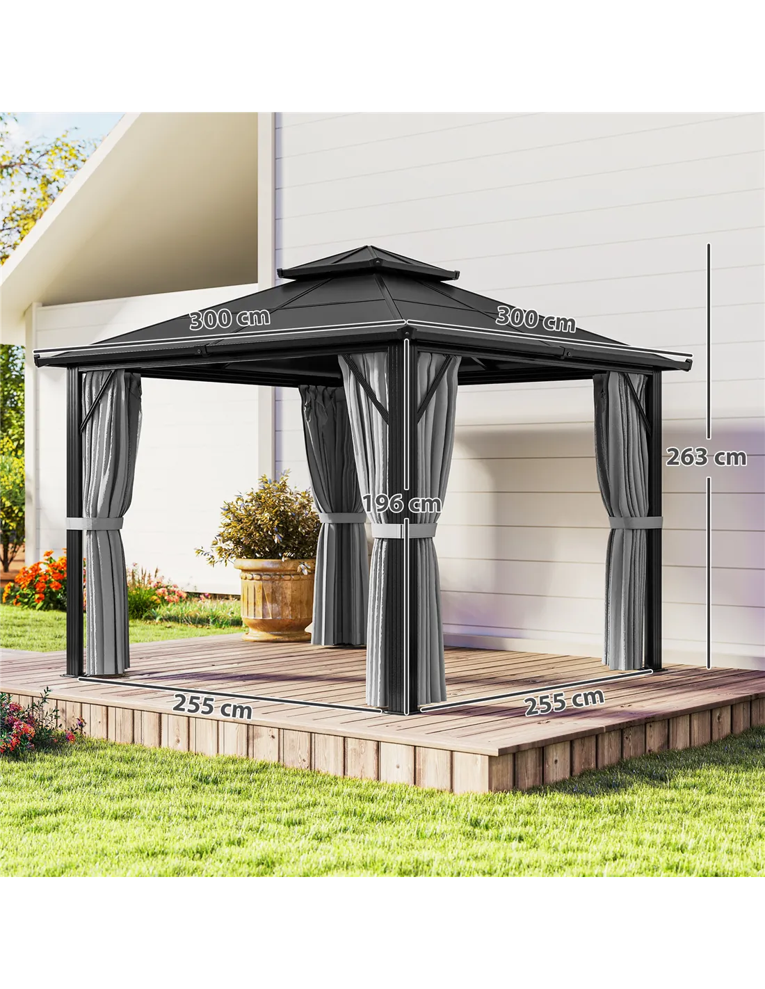 Outsunny 3 x 3(m) Hardtop Gazebo Canopy with UPF30+ Double Polycarbonate Roof, Aluminium Frame Garden Gazebo Permanent Pavilion with Mosquito Netting and Curtains for Patio, Deck, Grey