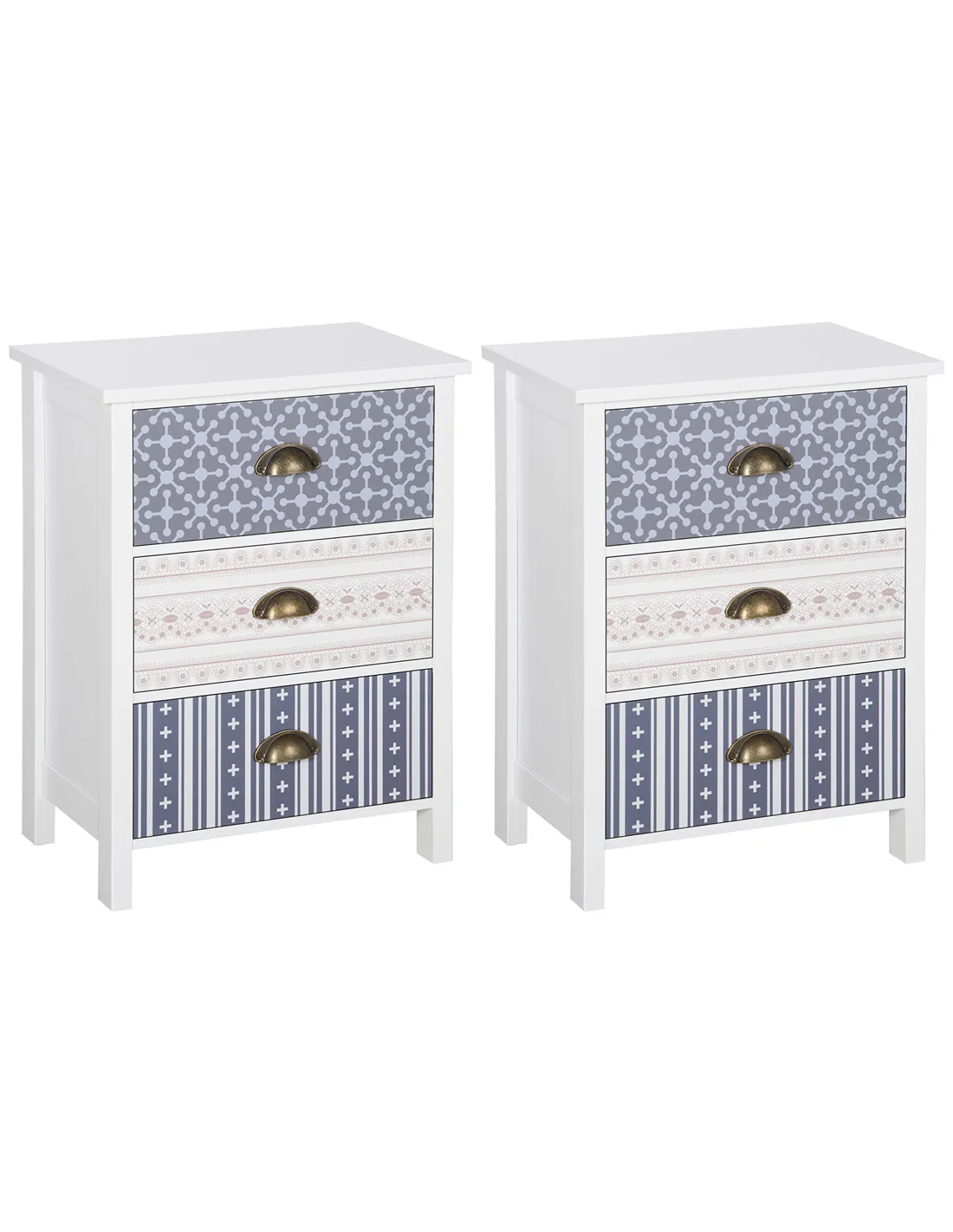 HOMCOM Bedside Table Set of 2 Chest of 3 Drawers Shabby Chic Nightstands with Metal Handle Sofa Side Table for Living Room, Bedroom, Purple