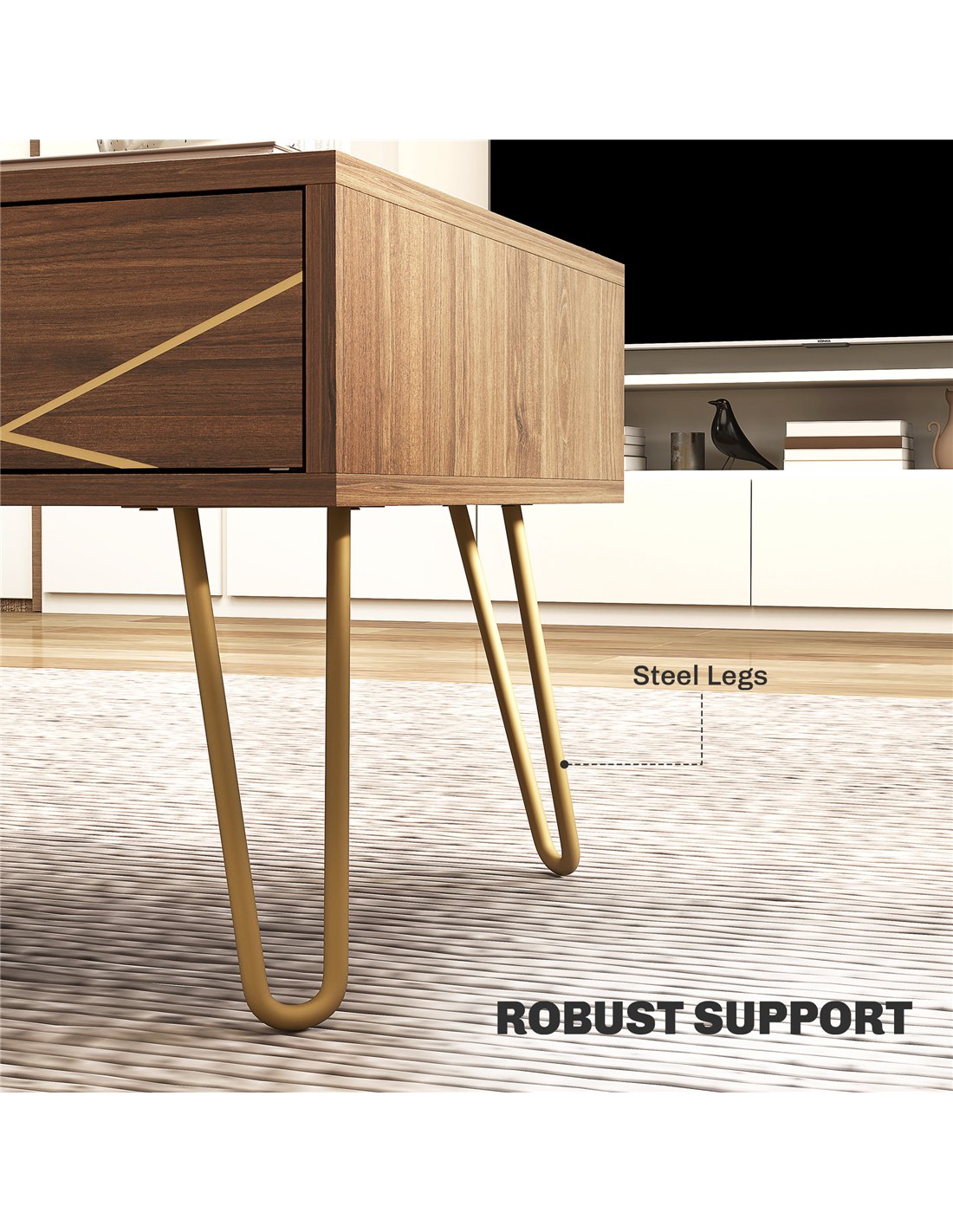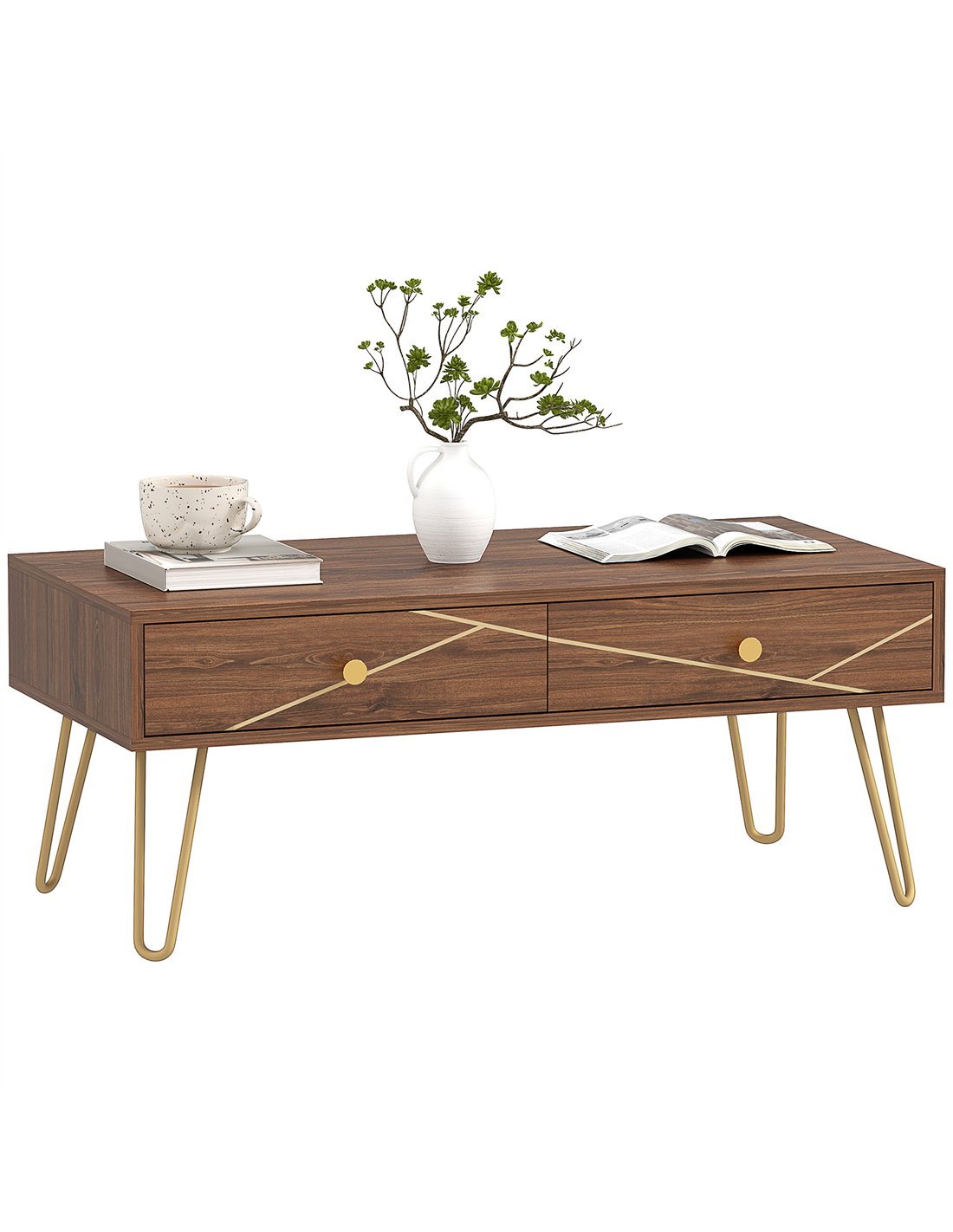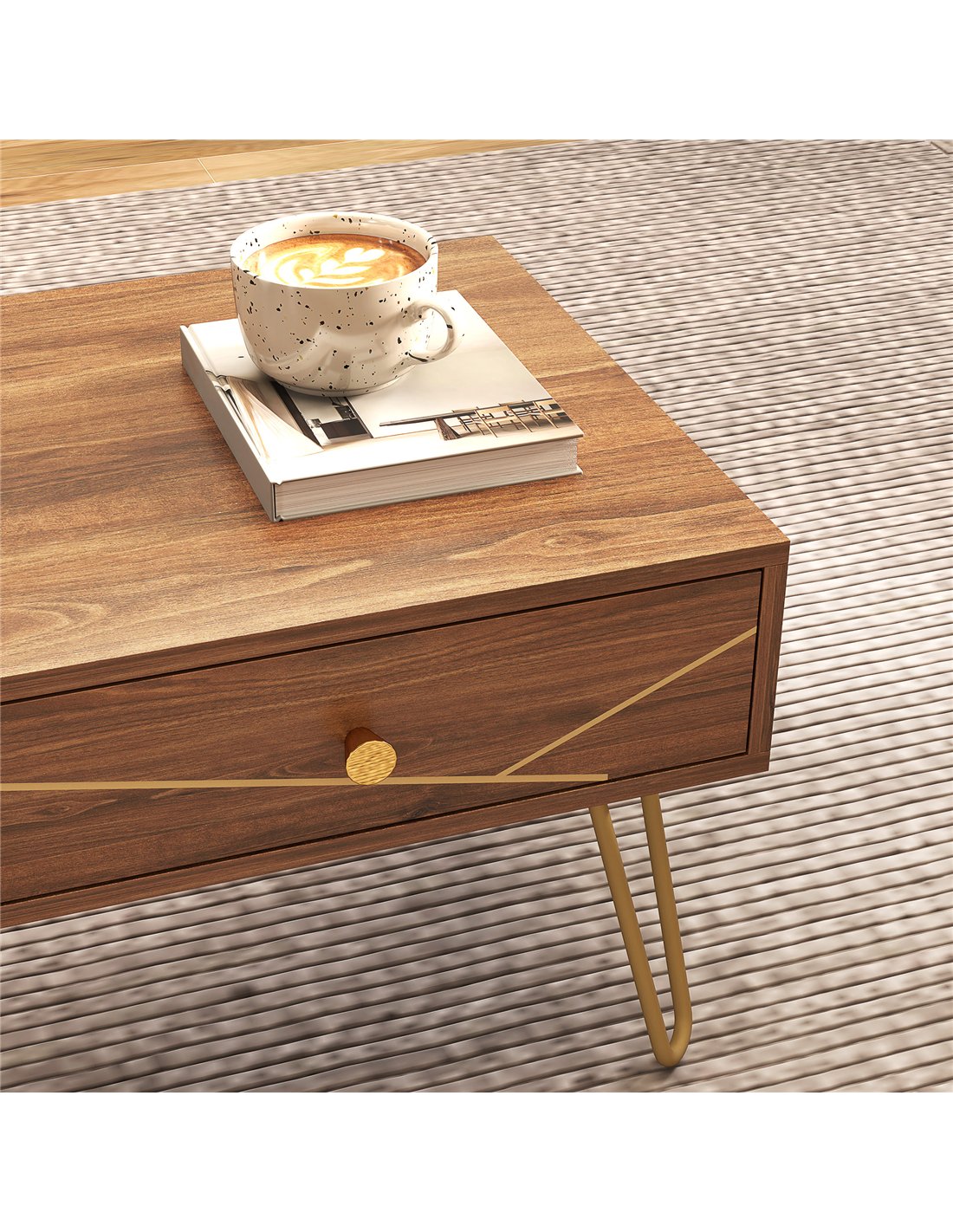 - Thanks to its elegant woodgrain finish with gold-tone accents and hairpin legs, it complements a variety of interior styles, from modern to contemporary British homes.