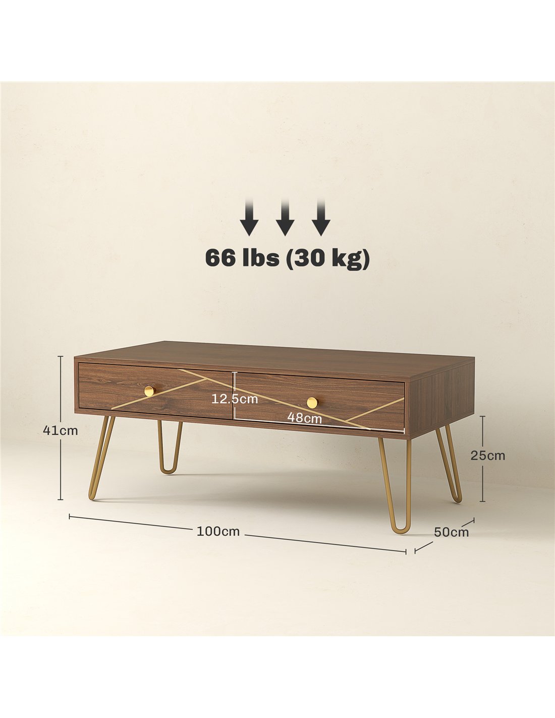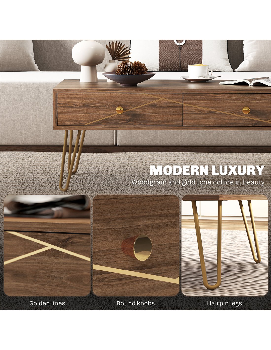 Elevate your lounge with the HOMCOM living room coffee table, where modern luxury meets practical design. Wood-effect panels adorned with golden lines knobs and chic hairpin legs create a stunning focal point. Featuring a handy tabletop and two drawers, this living room table for living room effortlessly combines style with functionality, making it a charming addition to any space.