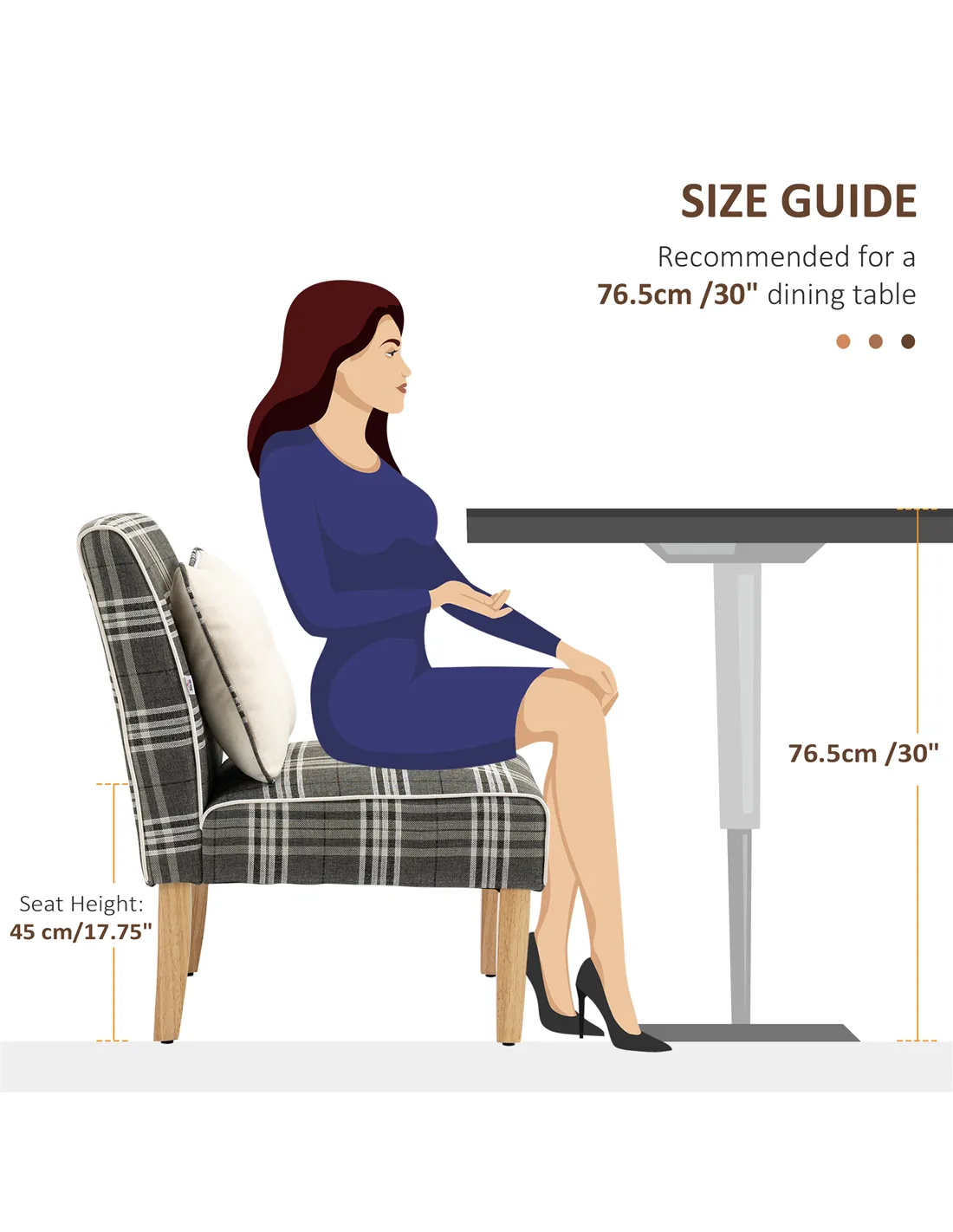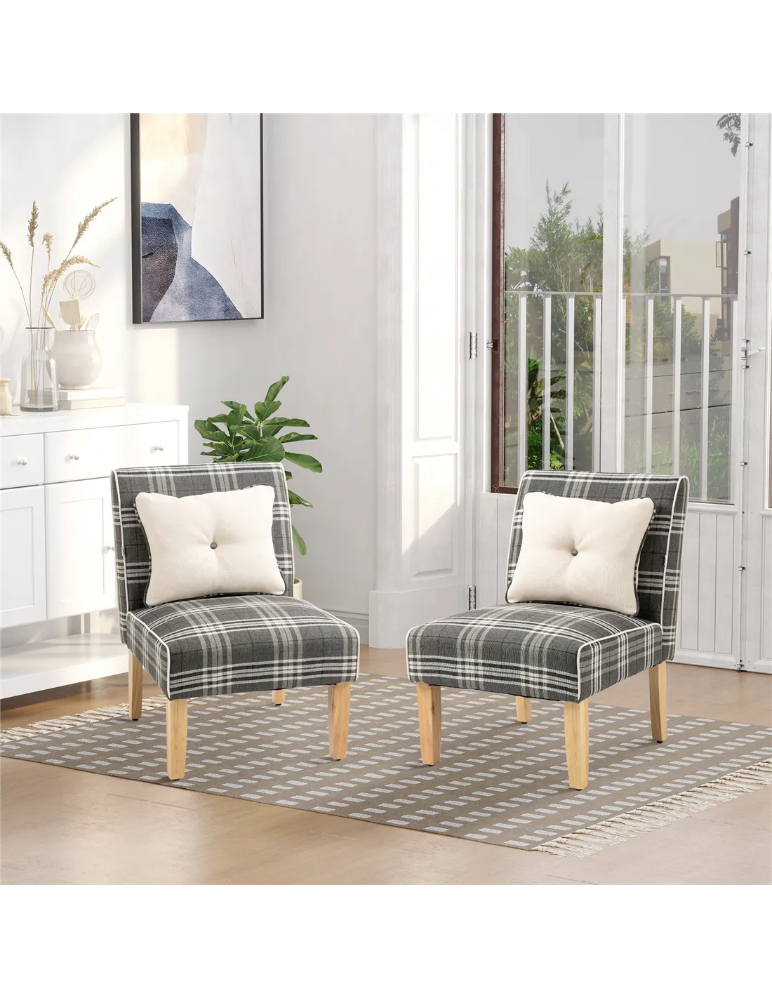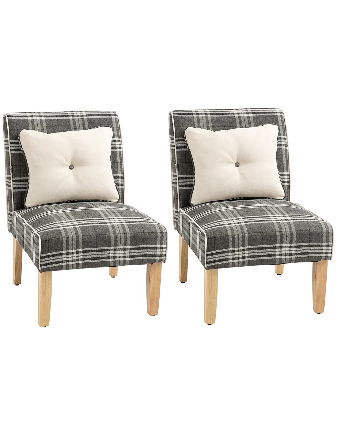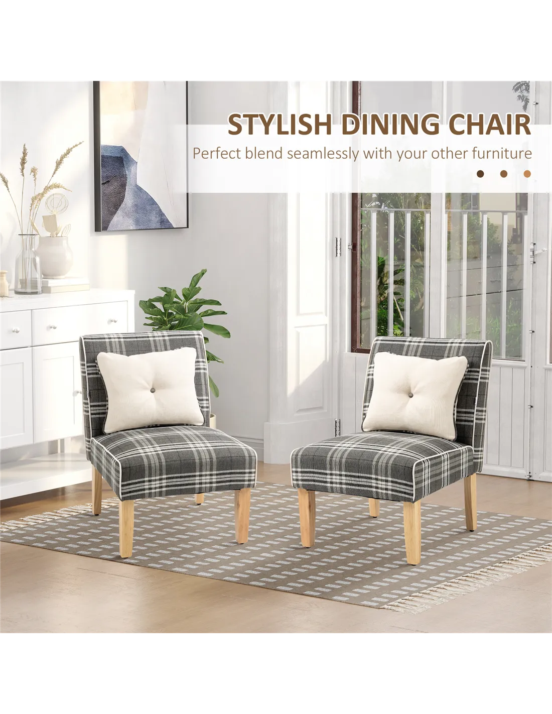 These stylish dining chairs from Homcom are perfect for enhancing both kitchen and living room interiors. Their elegant checked upholstery and neutral grey tone complement a variety of décor styles, from modern minimalist to cosy country homes. Use them as accent chairs in your dining area to create a welcoming atmosphere for family meals or casual gatherings. Thanks to their compact design and arm-free seating, they also work well as occasional chairs in a study or bedroom corner. The included throw pillows add an extra layer of comfort and style, making these chairs a versatile addition to any room.