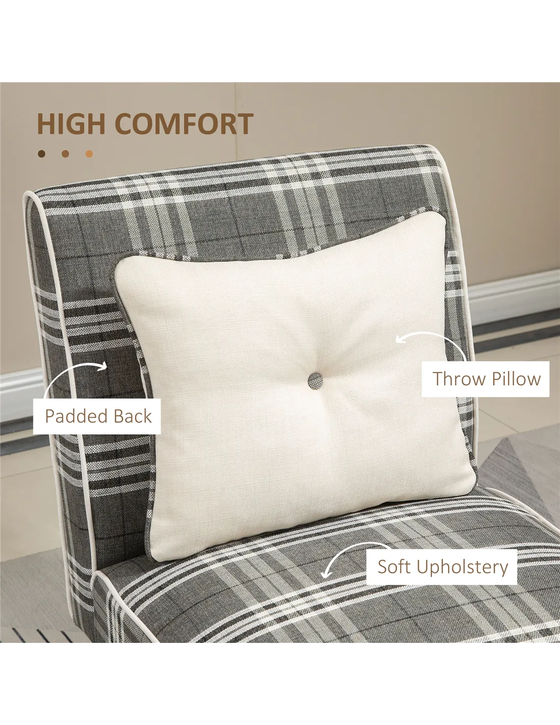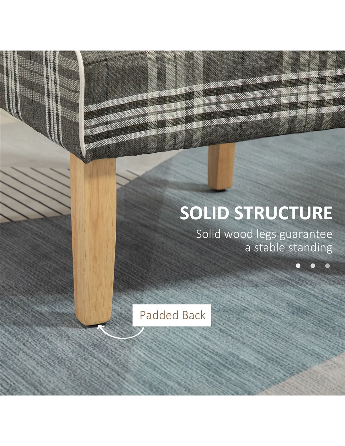 - Linen-touch upholstery is smooth, in a stylish checked plaid design