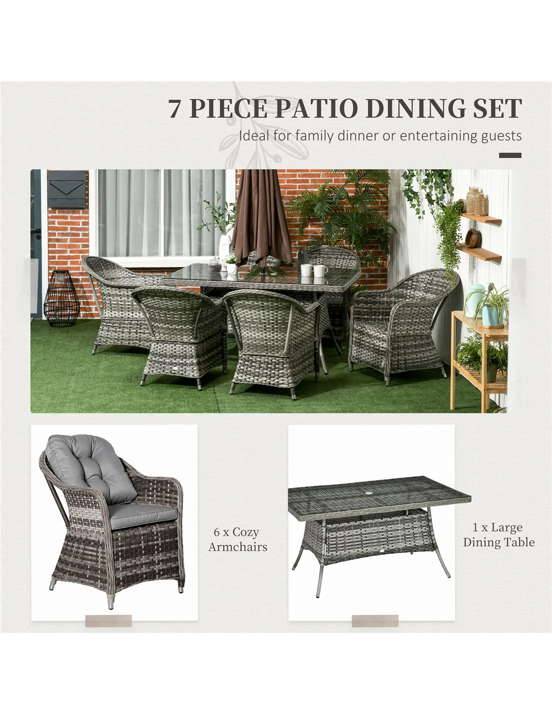 The Outsunny Seven-Piece Rattan Dining Set in grey is perfect for enhancing your outdoor space, whether it’s a garden, patio, or conservatory. Ideal for family dinners, weekend barbecues, or social gatherings, this set offers both style and practicality. The spacious table comfortably accommodates six guests, while the soft cushions provide added comfort for long, leisurely meals. Thanks to its durable aluminium frame and weather-resistant PE wicker, it remains a reliable choice throughout the seasons. The integrated parasol hole allows you to add shade on sunny days, making it a versatile addition to your outdoor living area.