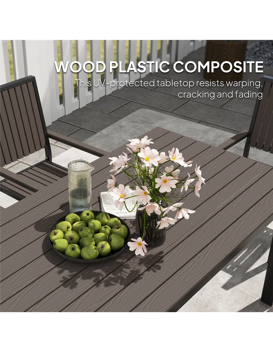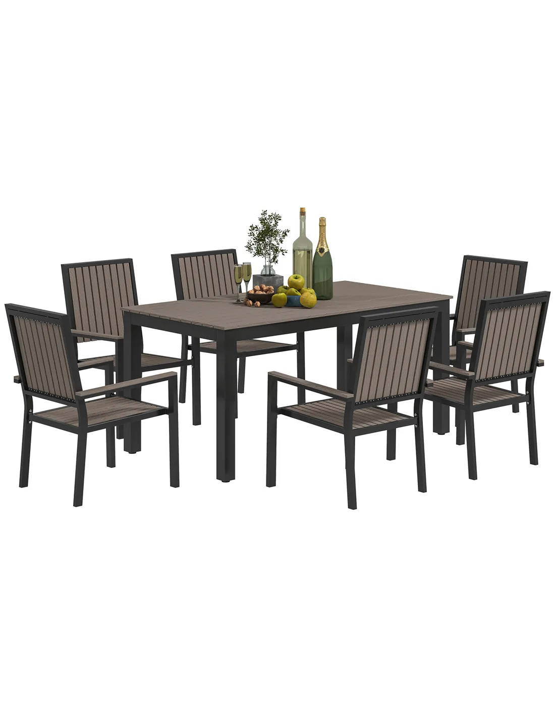 Elevate your outdoor dining experience with this Outsunny 6 seater garden table and chairs! The aluminium frame offers long-lasting durability, while the wood plastic composite tabletop is weather-resistant and easy to clean. Chairs can be tucked under the table or stacked, saving valuable space. Great for gardens, patios, or balconies, it combines style and practicality for every meal and gathering!