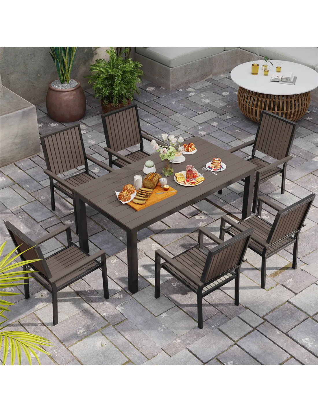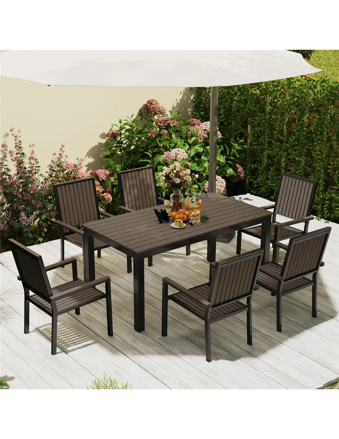 Outsunny 6 Seater Garden Dining Set with Stackable Chairs, Aluminium Frame, Rectangular Plastic Top, Garden Furniture Set, Outdoor Dining Table and Chairs for Patio, Balcony, Poolside, Brown