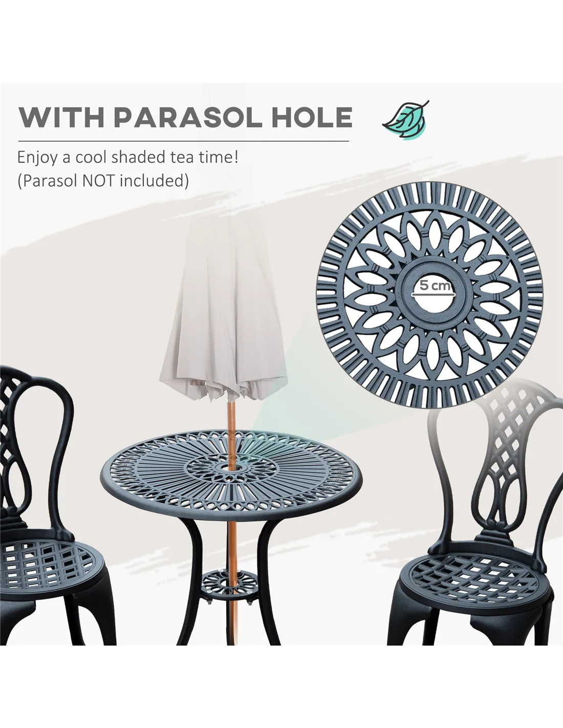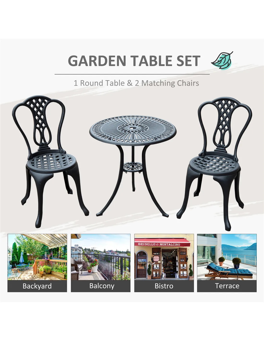 The Outsunny 3 Piece Patio Cast Aluminium Bistro Set is an ideal choice for creating a cosy outdoor retreat. Perfect for morning coffees on the patio, alfresco dining in the garden, or relaxing with a book in the fresh air. Its compact design suits small terraces, balconies, or conservatories, while the parasol hole allows for added shade on sunny days. Thanks to its durable aluminium construction and shabby chic aesthetic, this set complements both traditional and contemporary outdoor spaces, enhancing your garden’s ambience with effortless style.