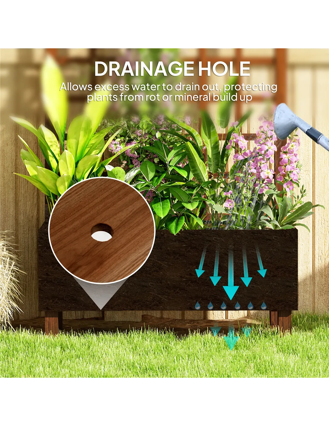 This Outsunny raised garden bed comes with a back trellis - grow plants, flowers, vegetables and let vines and more wrap themselves around the back. Wooden structure makes it strong, with a paint coating for gentle protection. Planter comes with fabric bag to hold the soil together, with two small holes for gentle water drainage.