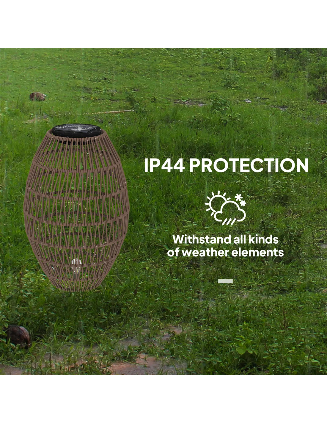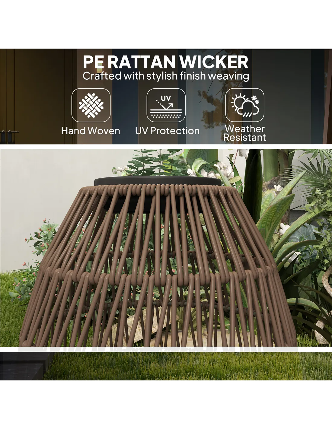 - UV-resistant plastic rattan and IP44 waterproof rating for outdoor use