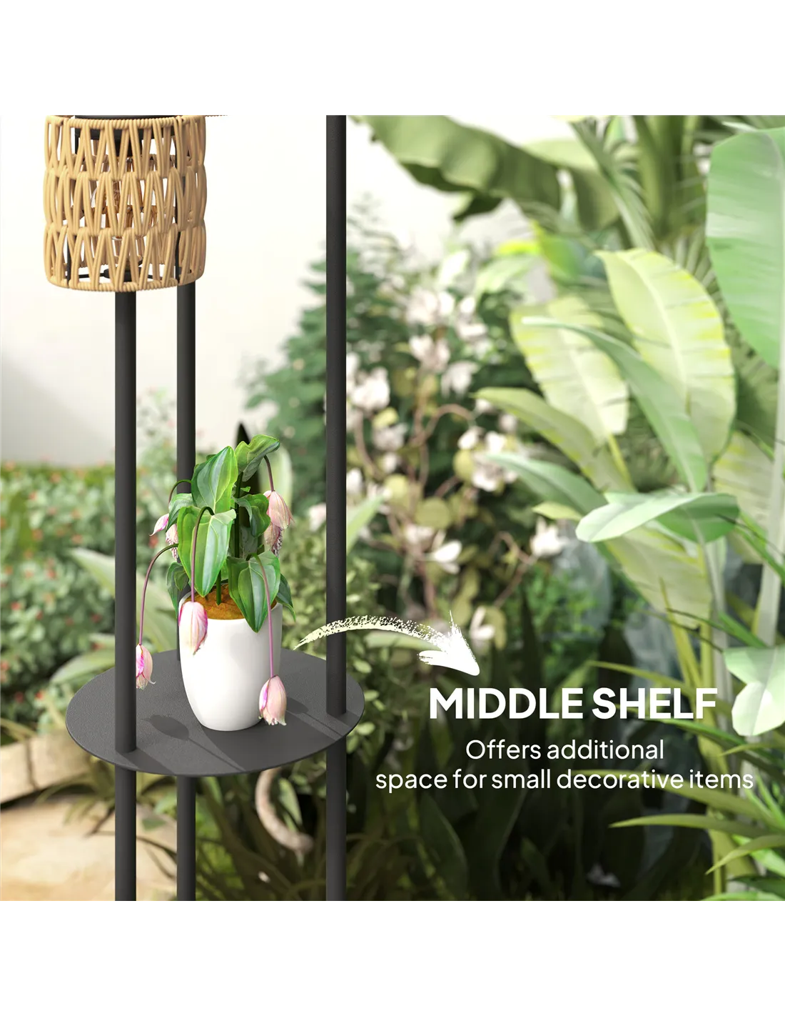 Brighten your garden with the Outsunny garden floor lamp with three rattan solar lights, combining a boho chic rattan lamp shade and solar-powered convenience. Enjoy automatic dusk-to-dawn lighting that promises up to eight hours of glow from a five-hour solar charge. This charming solar lamp combines a hand-woven PE rattan with a robust steel frame to withstand outdoor elements. Plus, a middle shelf adds a touch of practicality to this stylish rattan garden lamp.