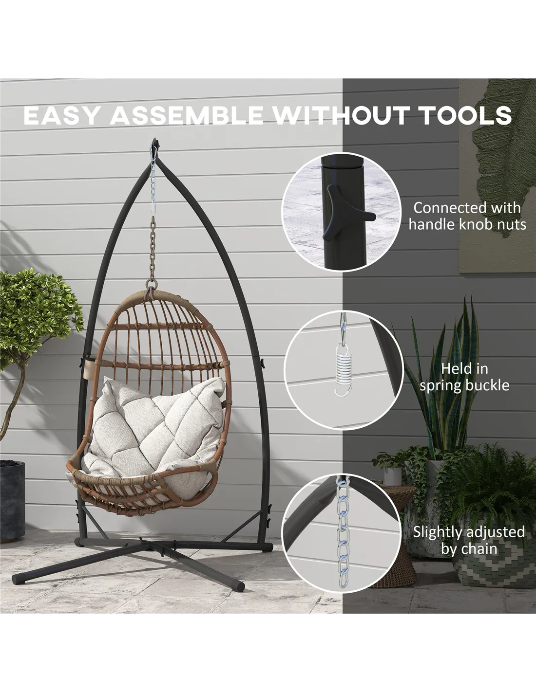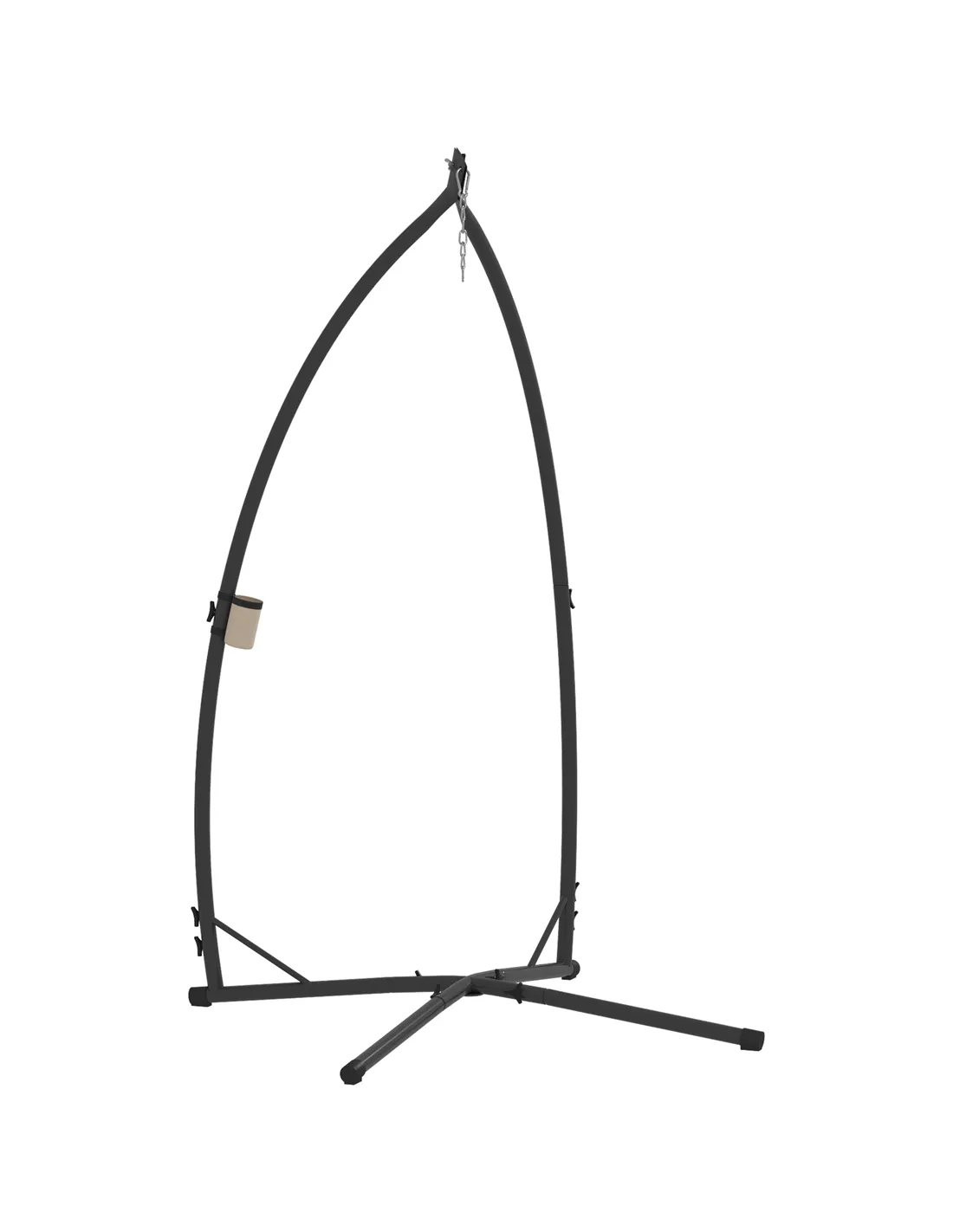 Thanks to this Outsunny hammock swing stand, you can hang and relax practically anywhere you want. The powder coated steel frame make the egg chair stand strong, paired with the spring buckle attachment to hold the chair securely in place and a steel chain for slight height adjustment. The hanging basket stand is supported by long legs and corner brackets for balance and stability. Complete with a handy cup holder for convenience.