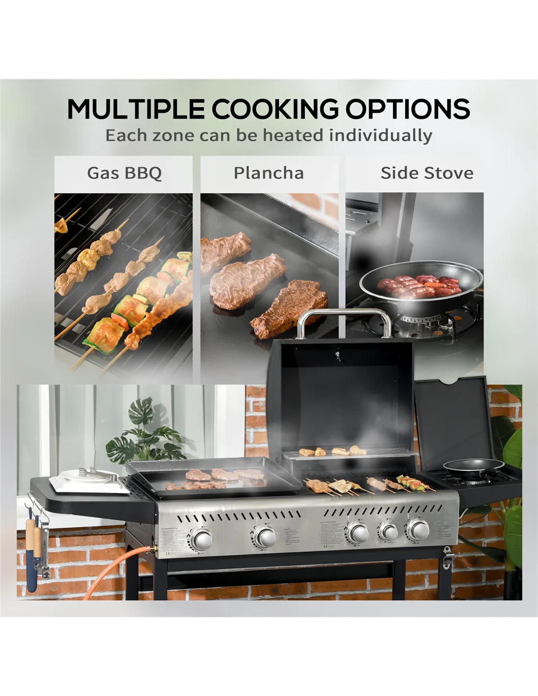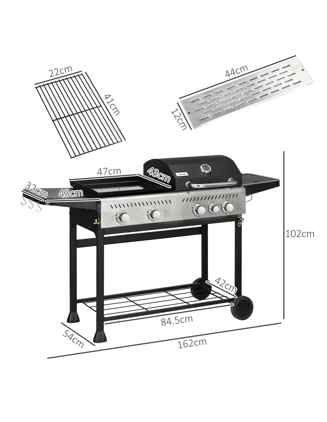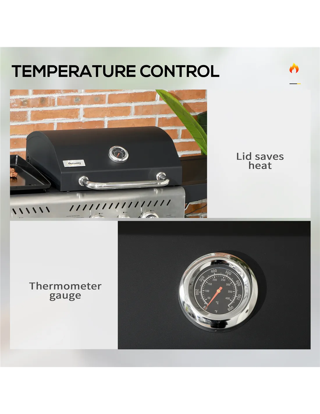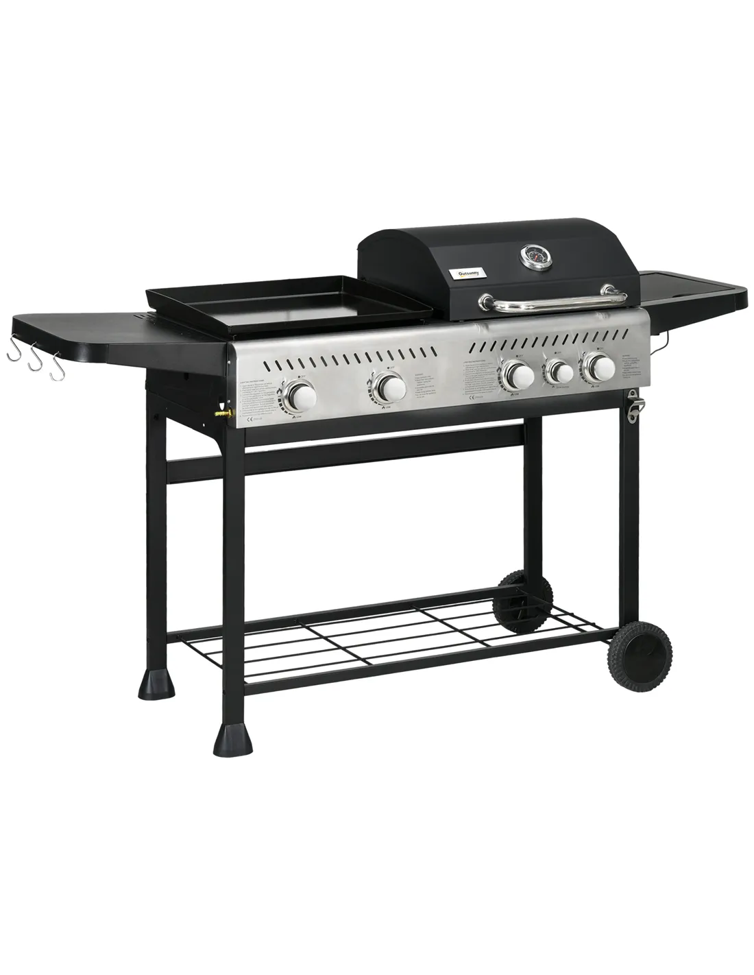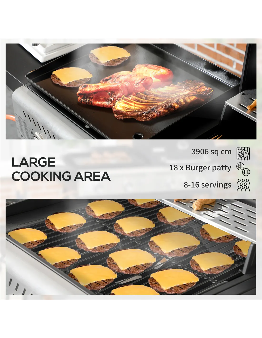 Sizzle and sear like a pro with this Outsunny deluxe BBQ. The two-in-one design combines a gas bbq and plancha grill. The 3825cm² cooking surface is large enough to cook 8-16 servings. Gas grill features a lid: control the smokiness, with the thermometer to see inside temperature easily. Use the side burner to add extra sizzle. Complete with two wheels to move around easily.