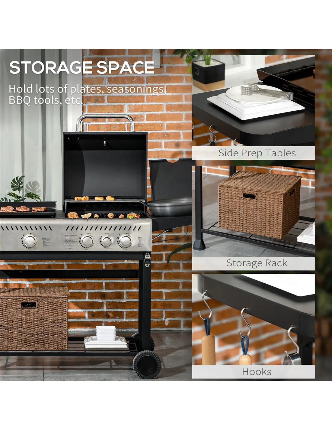 The Outsunny 12kW Deluxe Duo Gas BBQ is perfect for a variety of outdoor cooking occasions, whether you're hosting a family gathering, a casual weekend barbecue, or an alfresco dinner party. Its dual-function design, combining a gas grill and plancha, allows you to sear steaks, grill vegetables, or prepare delicate seafood with ease. The side burner is ideal for simmering sauces or warming side dishes, making it a versatile addition to any garden or patio. Thanks to its spacious 3825cm² cooking surface, you can effortlessly prepare meals for groups of 8 to 16 people. The built-in thermometer and lid help maintain precise cooking temperatures, ensuring perfectly cooked food every time. Move the BBQ around your outdoor space with the integrated wheels, and keep utensils and condiments organised on the side racks and shelves for a seamless cooking experience.