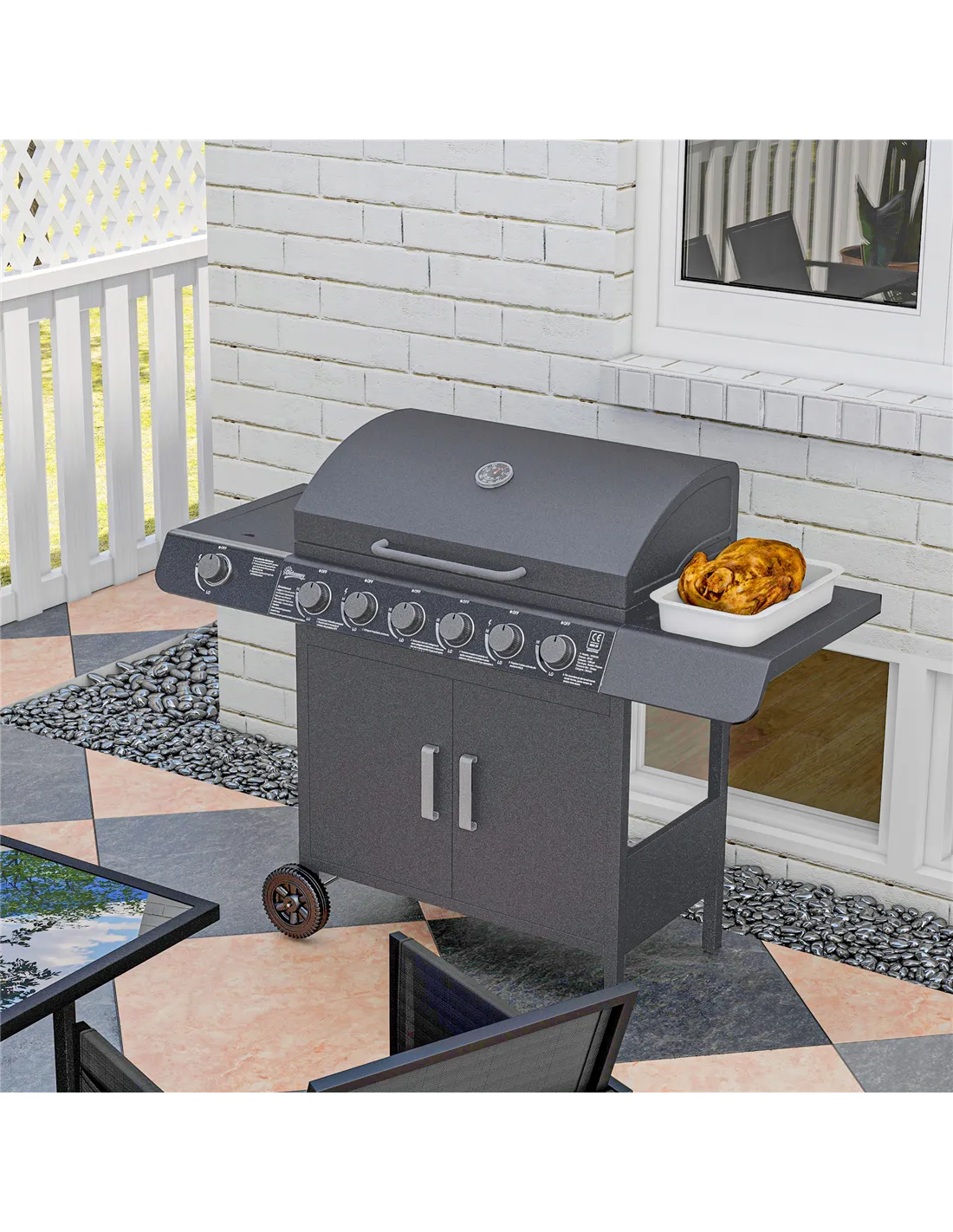 Get friends together and enjoy delicious BBQ food with this Outsunny gas grill. It features six main burners, with and a side cooking plate with individual gas burner; controlled by piezo ignition for easy, separate operation. The large 2646cm² grilling area means plenty of cooking space. An easy-to-read thermometer is connected to the lid. Two shelves on both sides and cupboard provide storage, complete with two wheels to move easily.