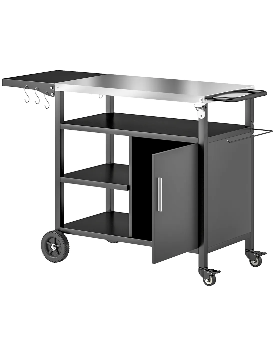- Integrated storage shelves, hooks and a towel rack keep grilling tools within reach