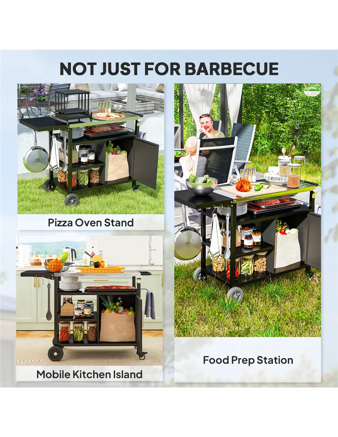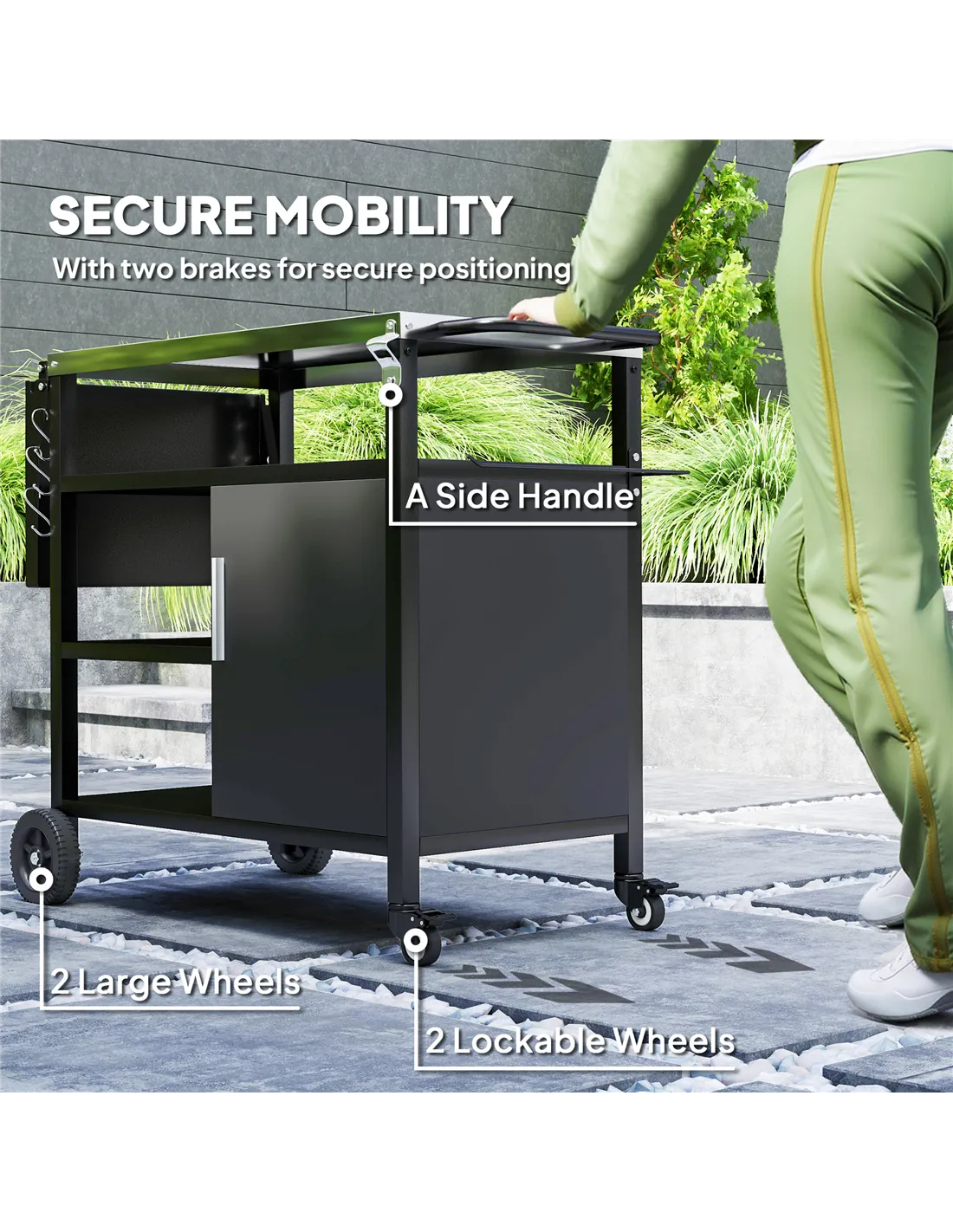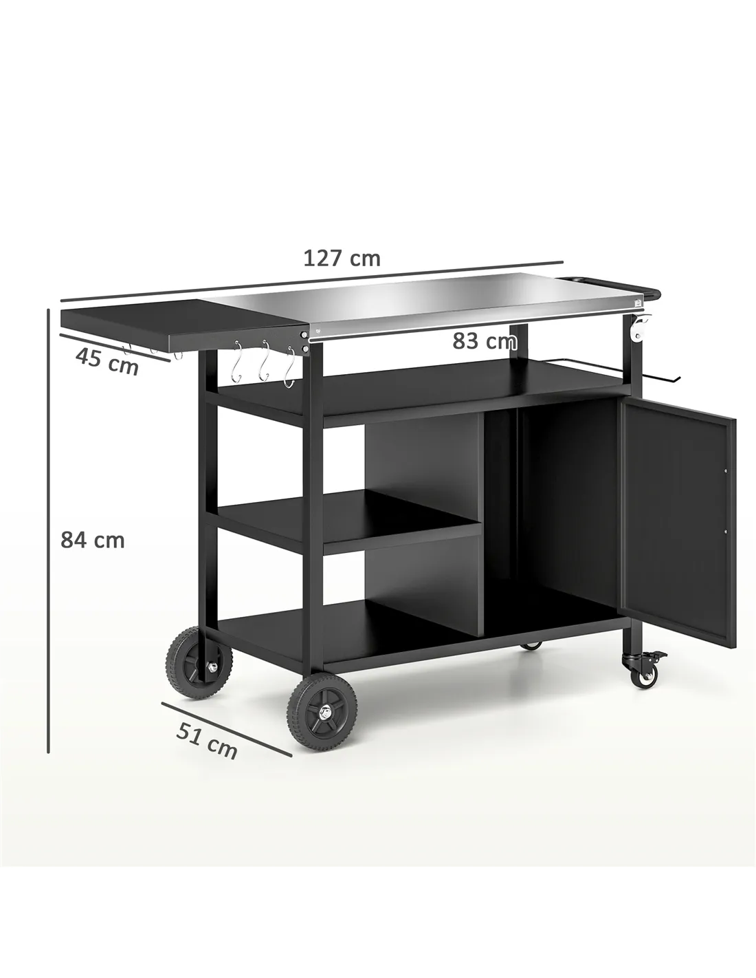 The Outsunny BBQ trolley is an ideal addition to any British garden or patio, perfect for alfresco dining and outdoor entertaining. Use the foldable side table to prepare ingredients or serve dishes, while the stainless steel top offers a durable workspace resistant to heat and weather. Its mobility allows you to position the trolley conveniently beside your grill or pizza oven, making it effortless to move between cooking and dining areas. The integrated shelves and hooks keep utensils, spices, and towels organised and within easy reach, enhancing your outdoor cooking efficiency. Whether hosting a summer barbecue, pizza night, or casual garden party, this versatile outdoor kitchen cart adapts to your needs, providing a stylish and practical solution for outdoor food preparation and serving.
