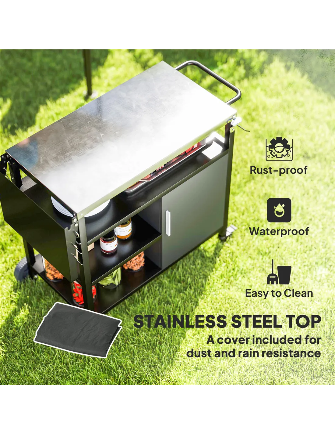 The stainless steel top and metal frame are rust-resistant and built to withstand outdoor elements. Additionally, the included cover provides extra protection when the trolley is not in use.