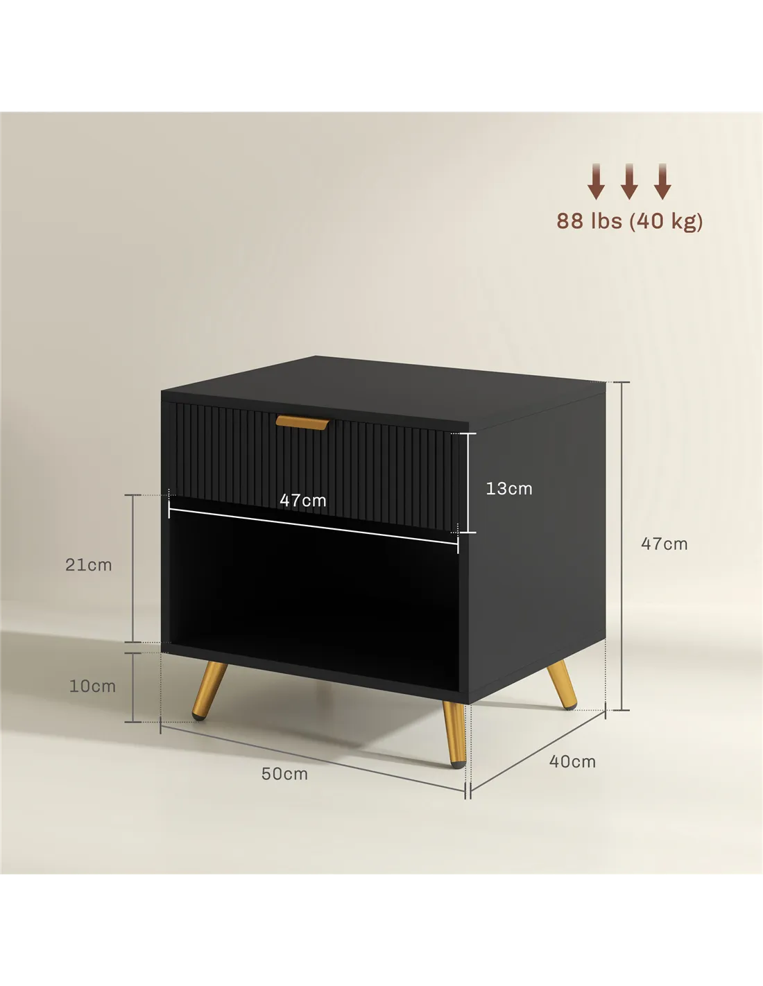 Easy elegance in the bedroom comes with this HOMCOM bedside table. The sleek black finish comes with gold tone coloured legs and drawer handle; paired with the rib detailing on the drawer front for a beautiful look. The drawer, bottom shelf and flat tabletop offer plenty of storage for all the essentials!