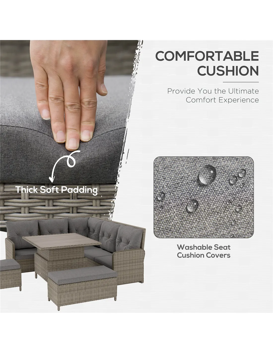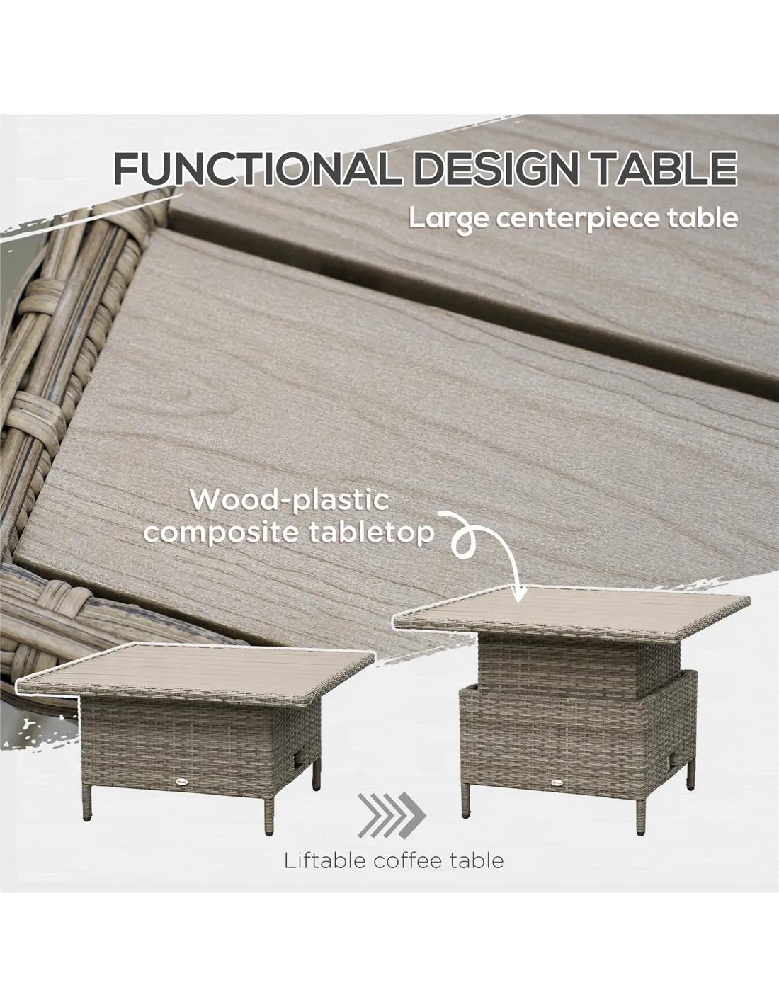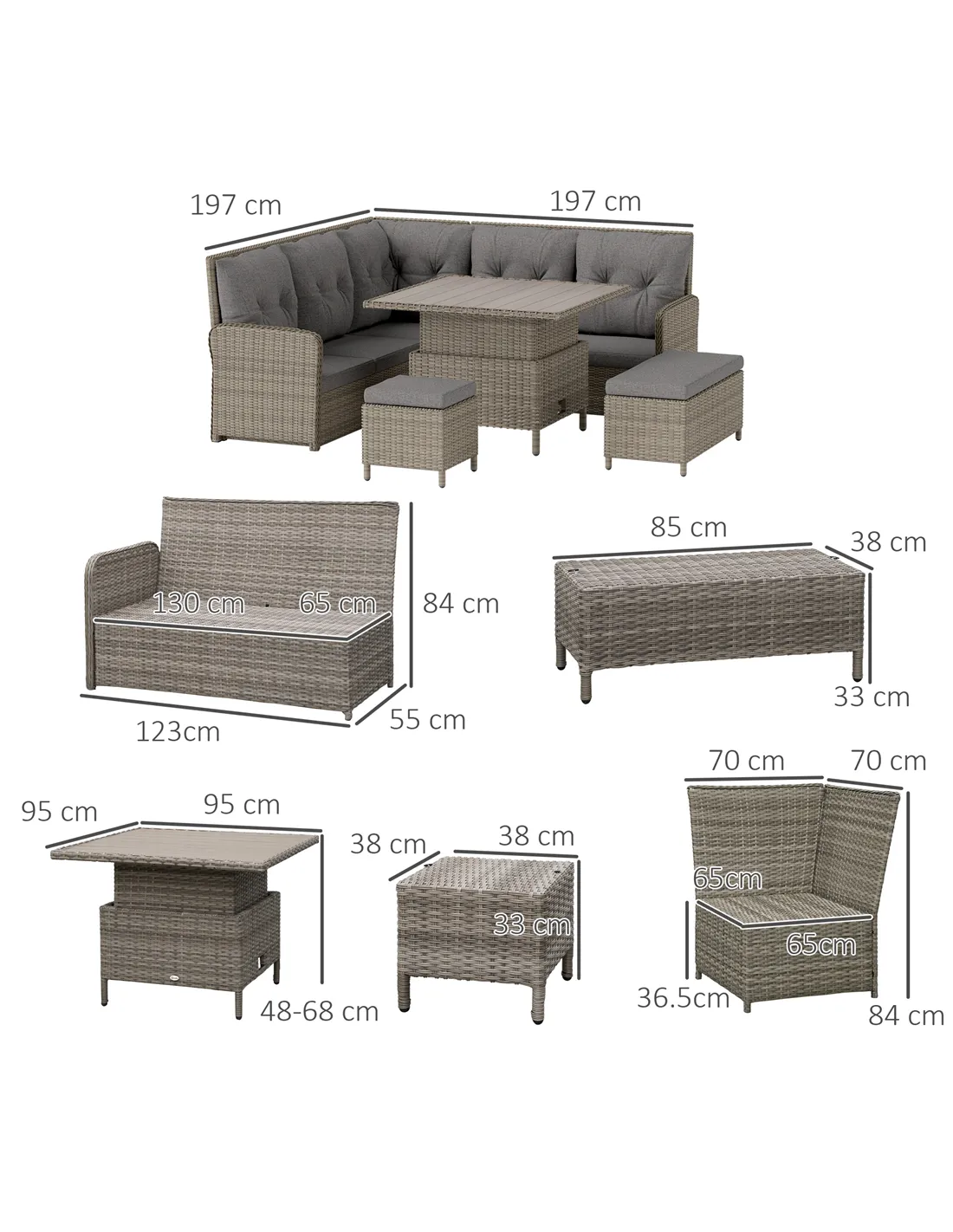Relax together in comfort and style in this Outsunny rattan corner sofa set., Six pieces: corner chair, right-handed loveseat, left-handed loveseat, long footstool, square footstool and a liftable coffee table - arrange in a way you want. Metal frame for a strong core, wrapped in plastic rattan for support, durability and style. The table can be raised or lowered-dine at a level you want; comes with a wood-effect top for extra beauty.