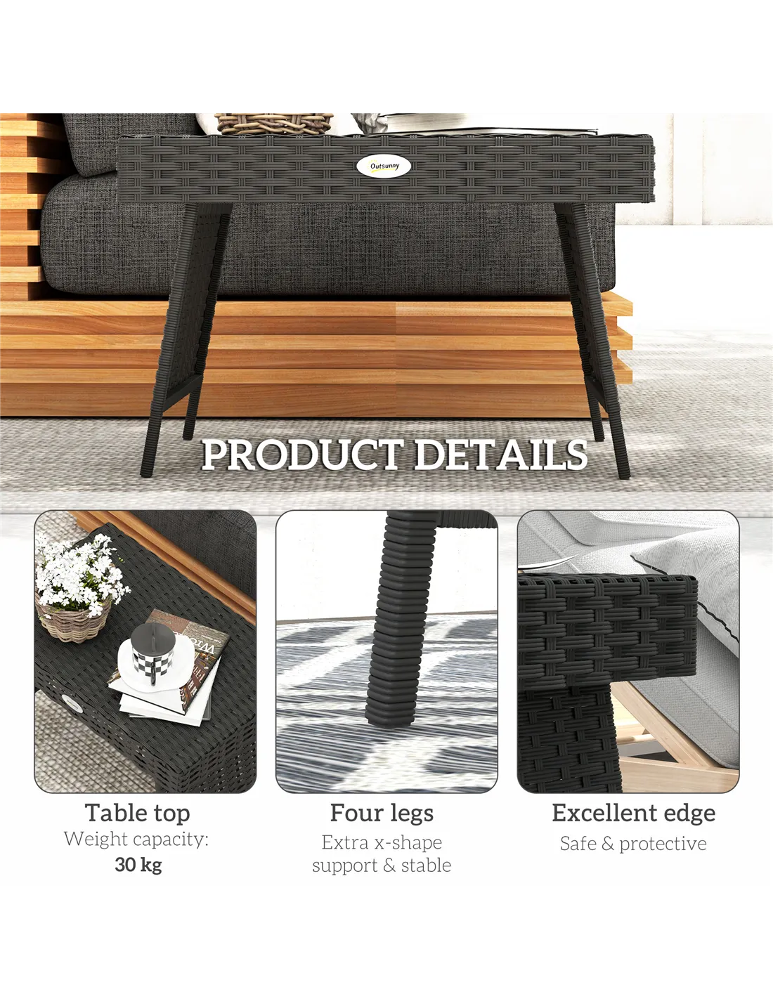 The table features PE plastic wicker, designed to withstand outdoor conditions while maintaining a stylish rattan look, ideal for long-term garden use. - What is the maximum weight the table can hold?