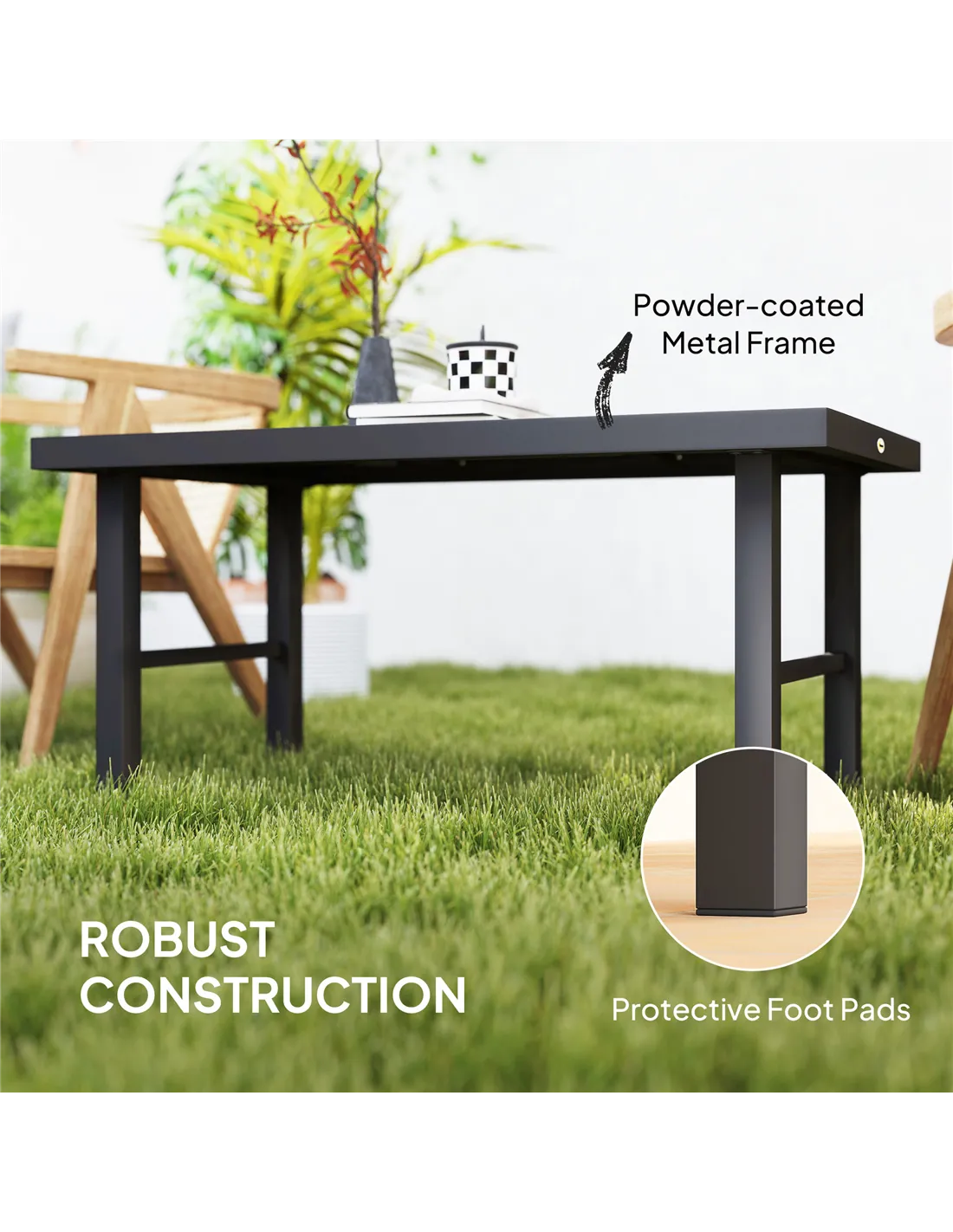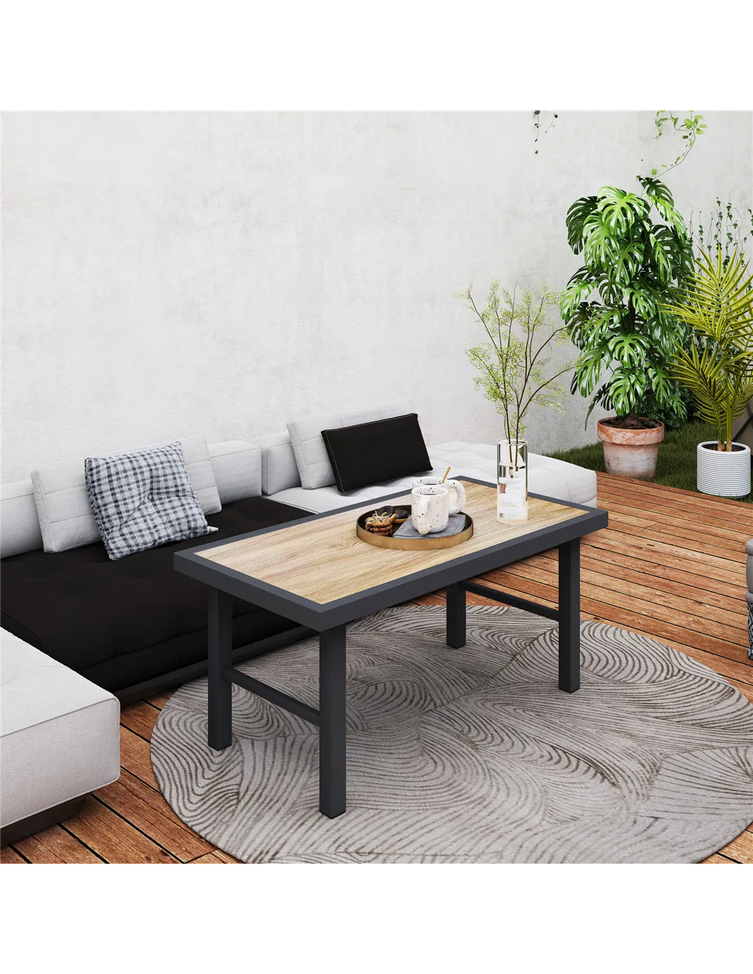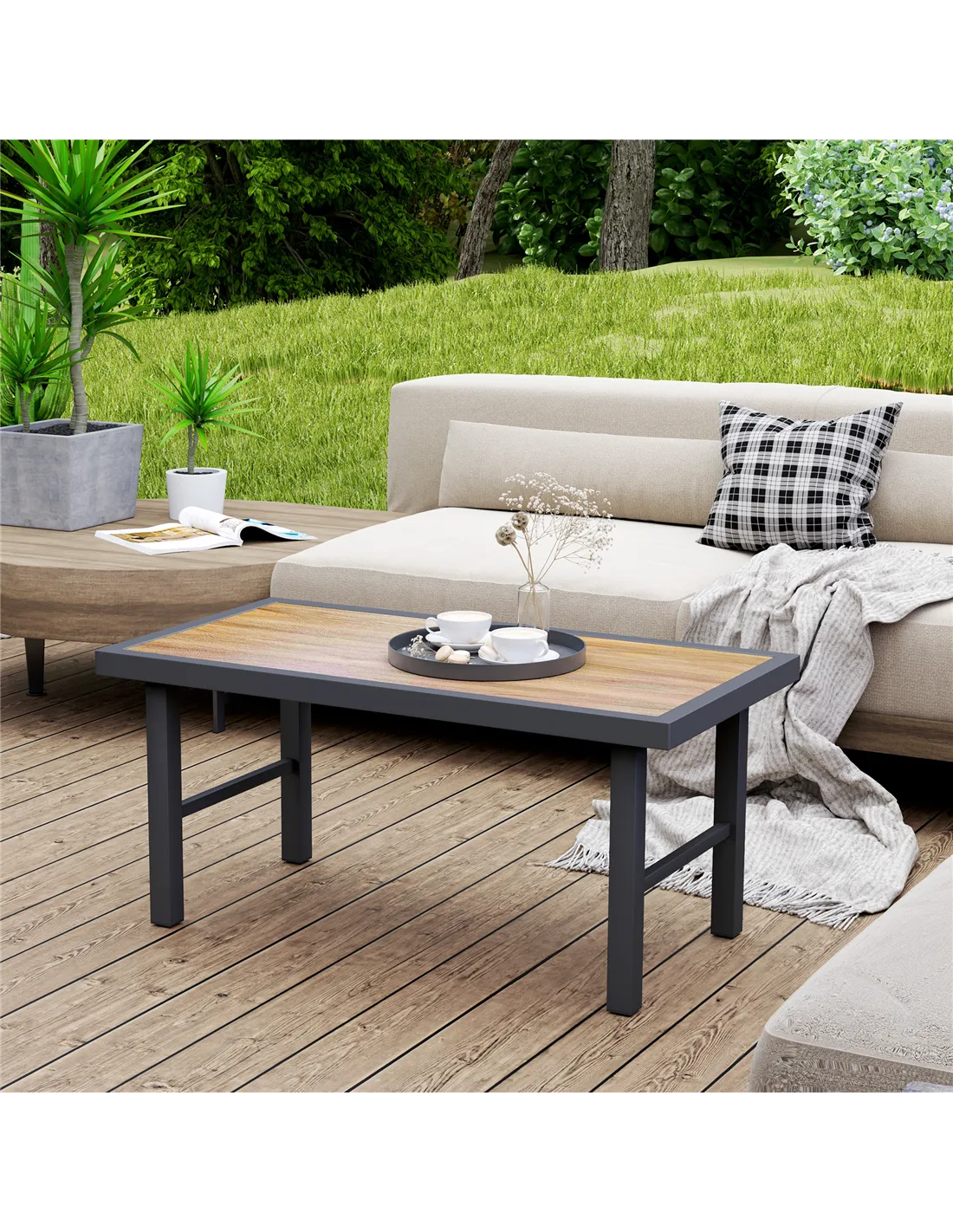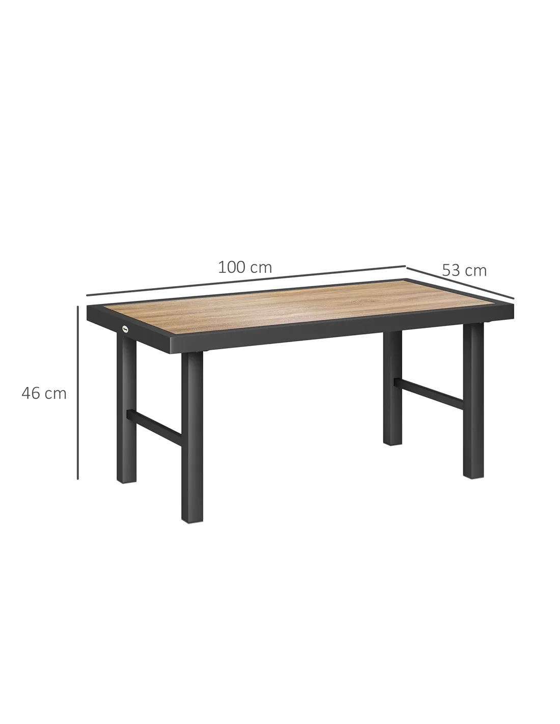 Outsunny Metal Garden Coffee Table, Outdoor Side Table with SPC Woodgrain Tabletop for Outside, Garden, Balcony, Porch, 100 x 53 x 46cm, Brown Wood Effect