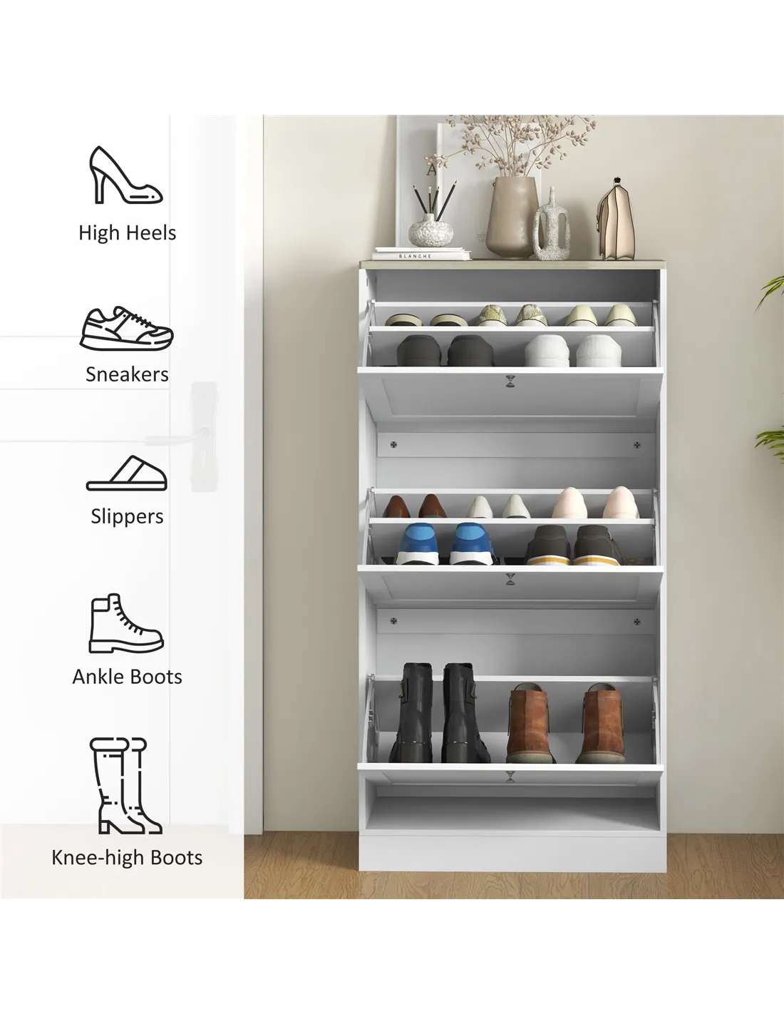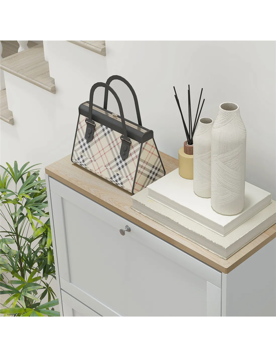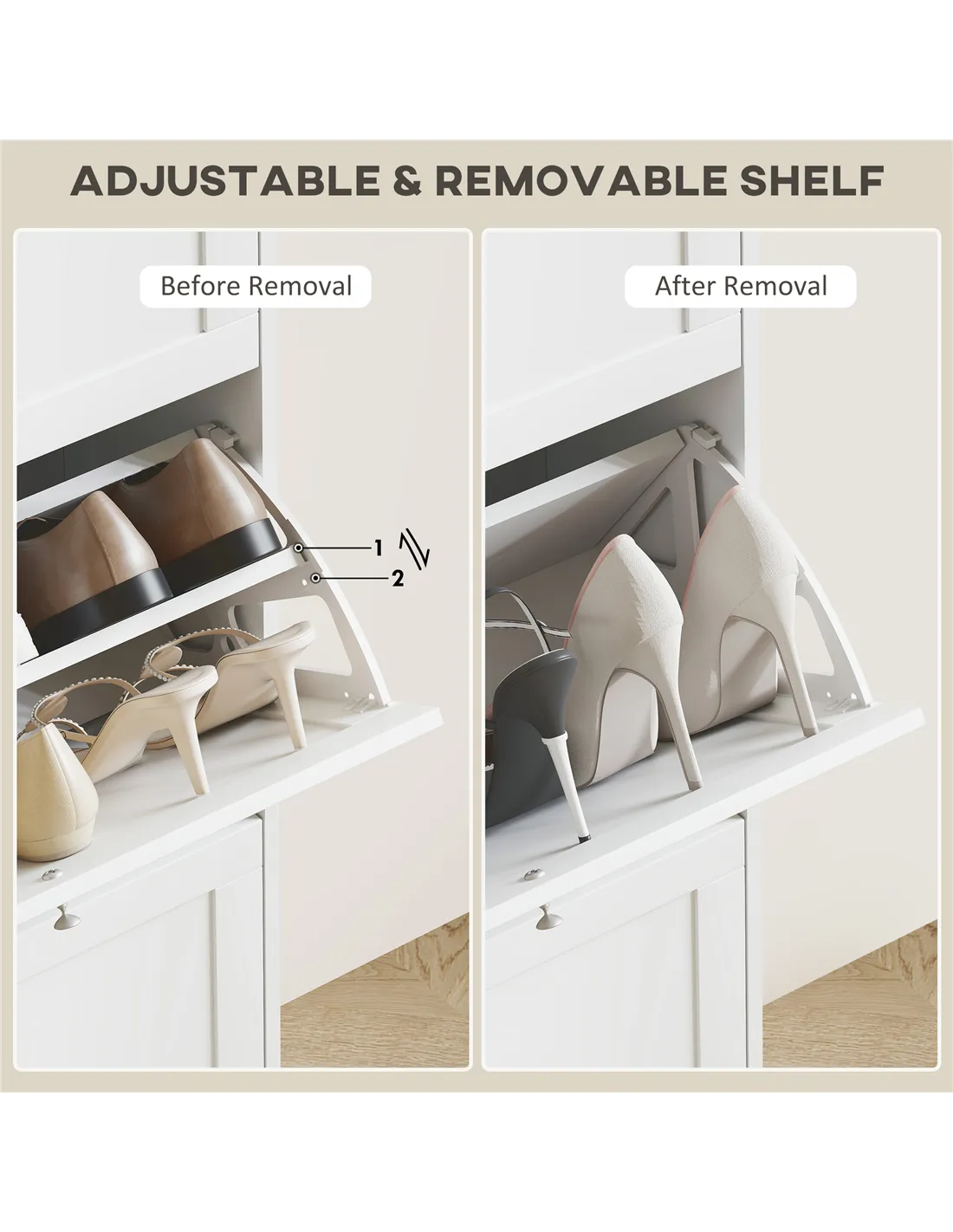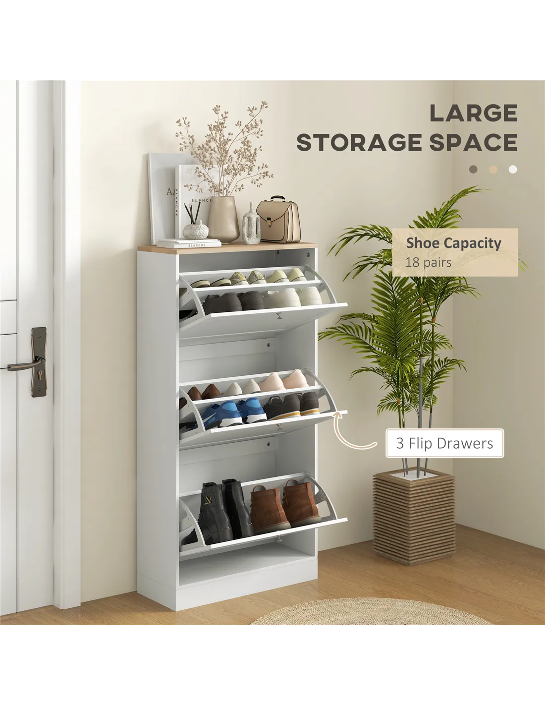 This HOMCOM shoe cabinet offers plenty of footwear storage, in a compact and stylish design. With three flip drawers, it can hold up to 18 pairs of shoes - spacious enough for individual and shared use. Each drawer has a two-level adjustable shelf to fit differently-sized shoes no problem. Shoe storage unit comes with anti-tipping hardware to safely attach to a wall; its narrow design is great for the smaller spots.