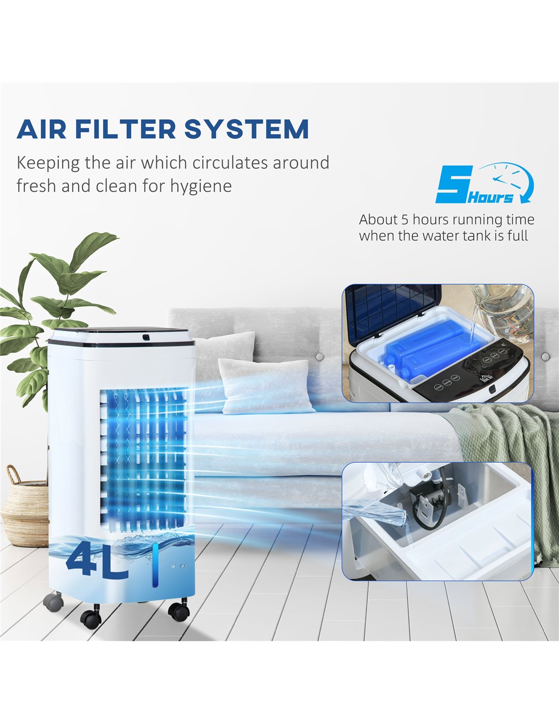 Keep your cool, whenever, with this HOMCOM evaporative air cooler. Three functions to switch easily: ventilating, ice cooling and humidifying; add the two ice packs for extra cool air. Switch between the nine settings: Low/medium/high fan settings with normal/natural/sleep modes to find a variation comfortable for you. The 4L tank provides about five hours of use, with the 30-minute intervals so it safely turns off when you need.