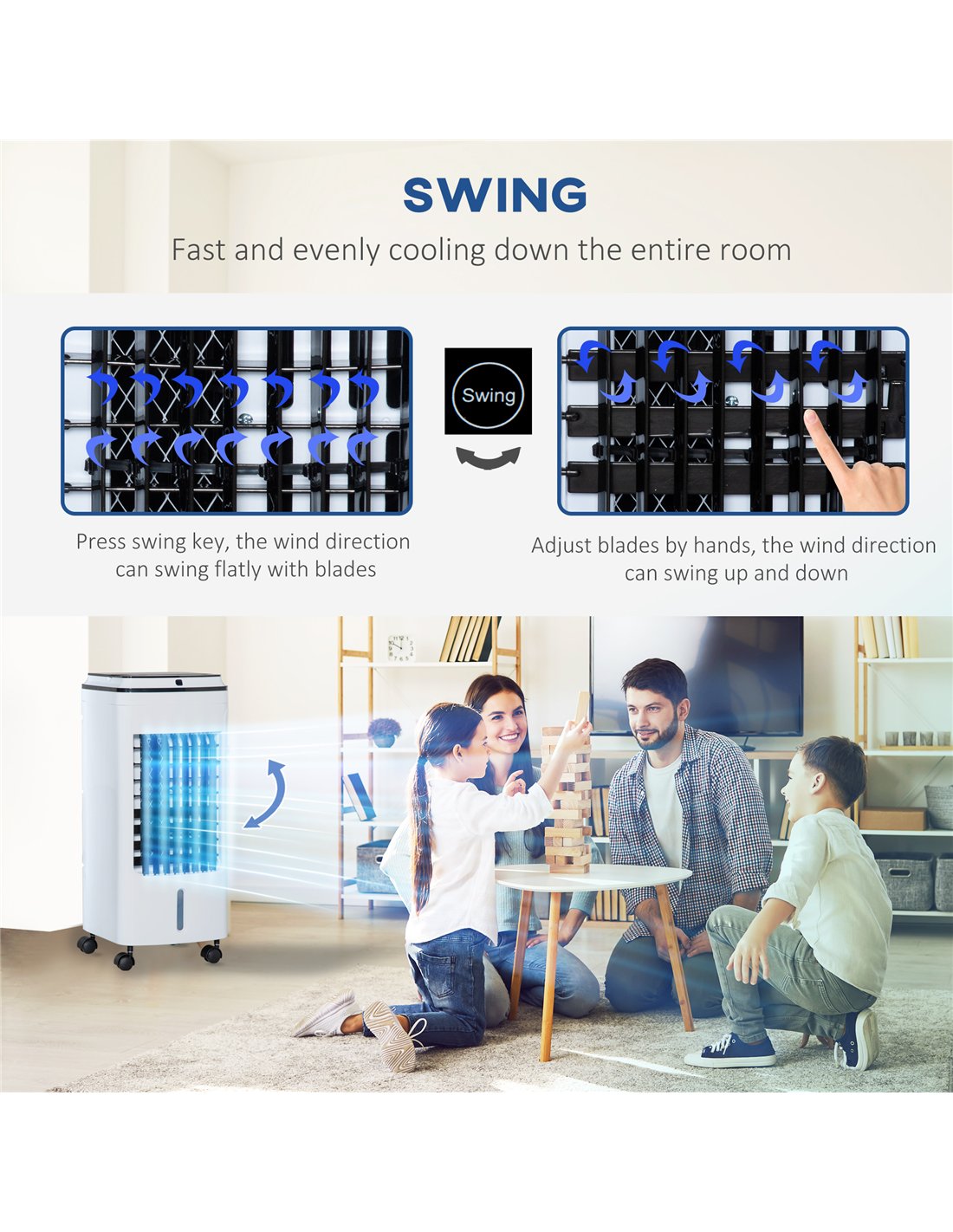 The HOMCOM 3-in-1 evaporative air cooler is ideal for enhancing comfort in various living spaces across UK homes. Perfect for bedrooms, home offices, or conservatories, it provides refreshing airflow while maintaining humidity levels. Use the portable fan cooler during warm summer days to circulate cool air efficiently, or add the included ice packs for an extra chill effect in your lounge or kitchen. Thanks to its compact design and wheels, it can be easily moved between rooms, making it a versatile solution for cooling and humidifying smaller areas up to 25 square metres. The automatic oscillation and adjustable vertical airflow ensure even distribution, creating a pleasant environment for relaxation or work. The timer and remote control add convenience, allowing you to tailor settings without leaving your seat.