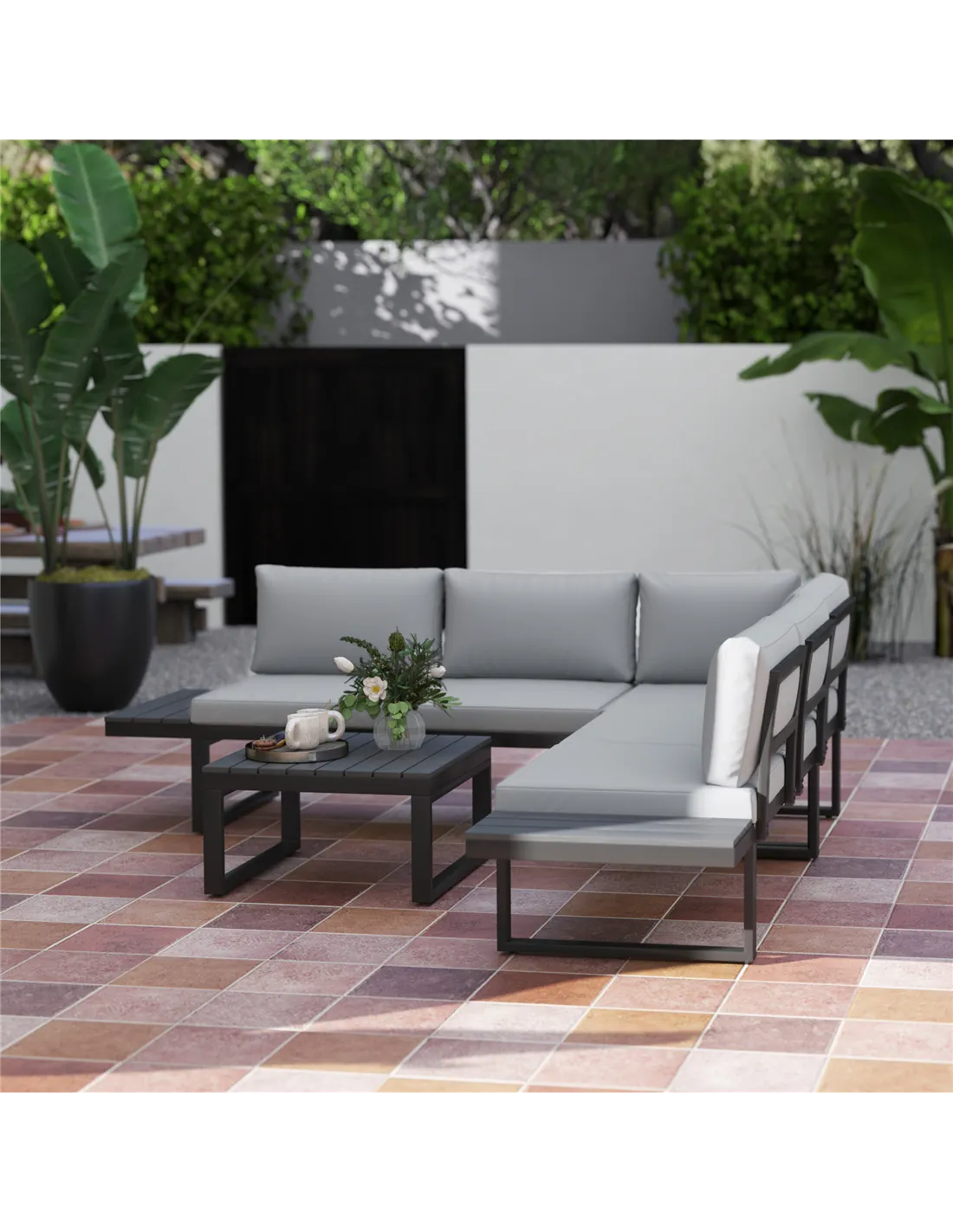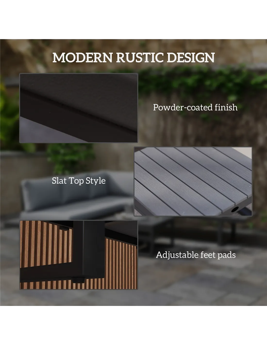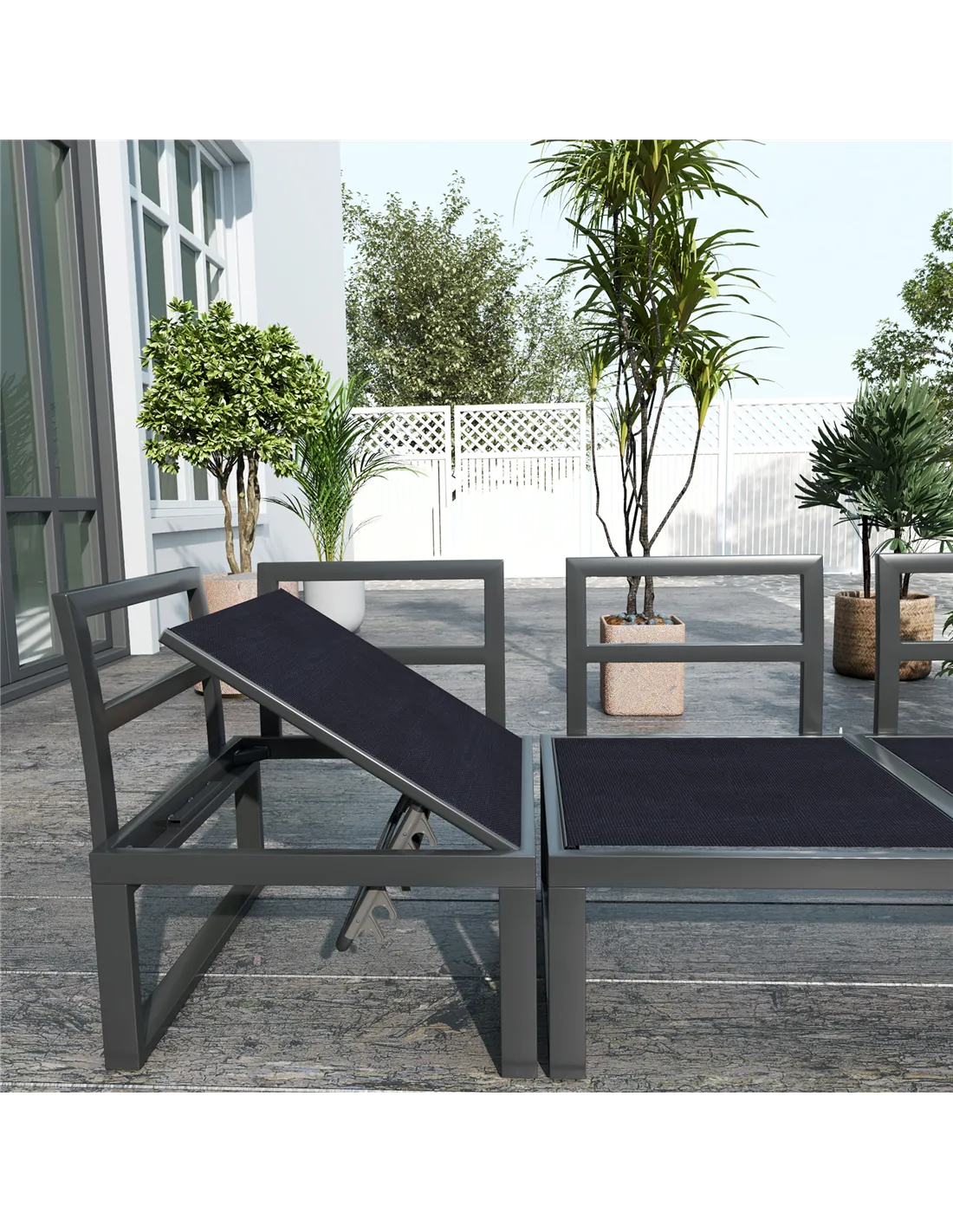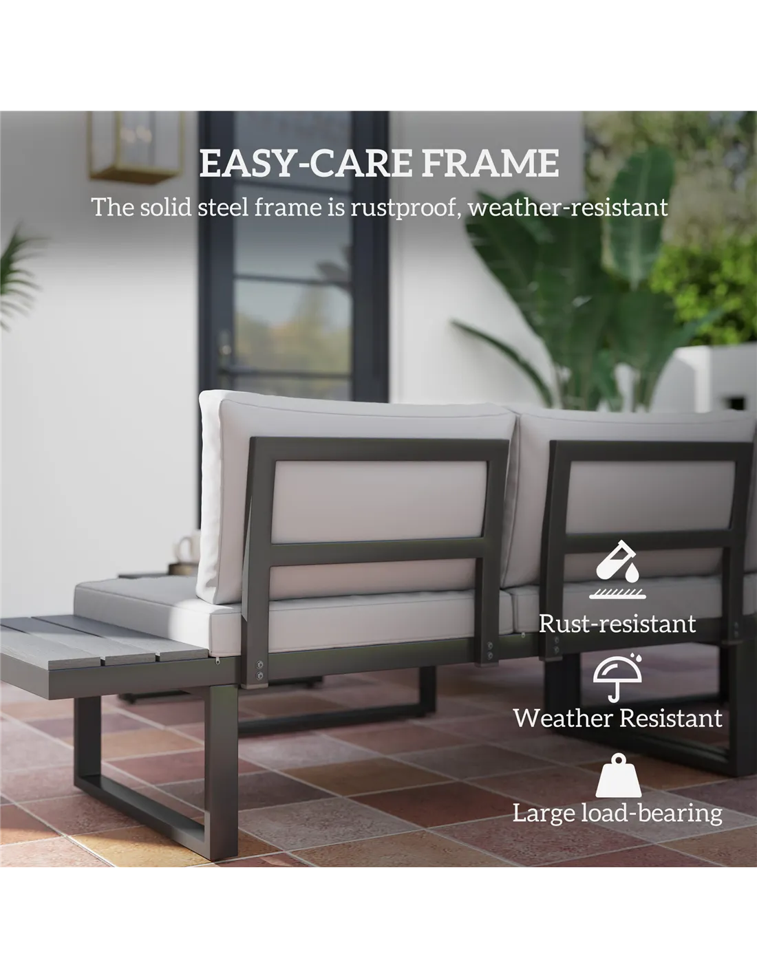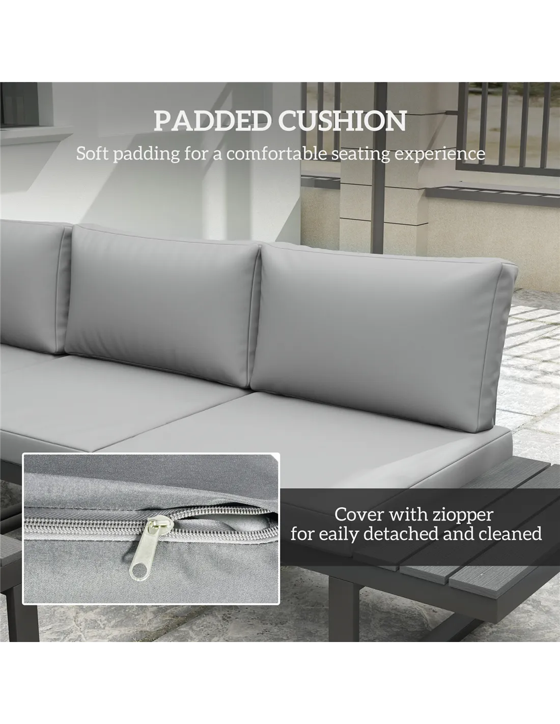 Outsunny 4 Pieces Garden Furniture Set, 5-Level Reclining Garden Corner Sofa Set, Outdoor Lounge Conversation Sectional with Cushions, Wood Effect Plastic Table, Black Frame & Light Grey Cushion