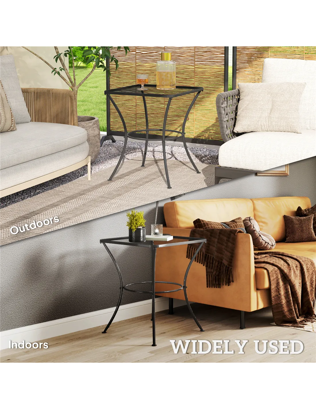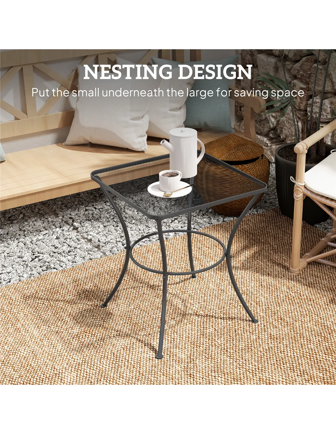 The Outsunny 60cm square garden table is a versatile addition to any outdoor space. Ideal as a compact bistro table for morning coffee on the patio or a side desk for alfresco dining, it complements garden seating perfectly. Its mesh top design allows rainwater to drain easily, making it suitable for placing potted plants or garden accessories without worry. Use it beside a sun lounger for drinks and snacks or as a practical workstation for outdoor hobbies. Thanks to its sturdy steel frame and balanced feet, it remains stable on various surfaces including decking, gravel, or lawn.