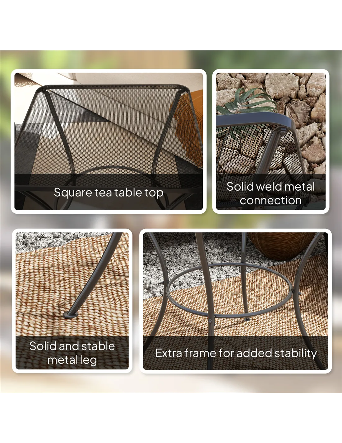 Enhance your garden with the stylish Outsunny outdoor table. Crafted from powder-coated steel for durability, its unique inwards-curved design promotes stability and adds a touch of elegance. The square mesh tabletop prevents water build up and is great for plants, drinks, or food. Pairs perfectly with other Outsunny outdoor chairs.