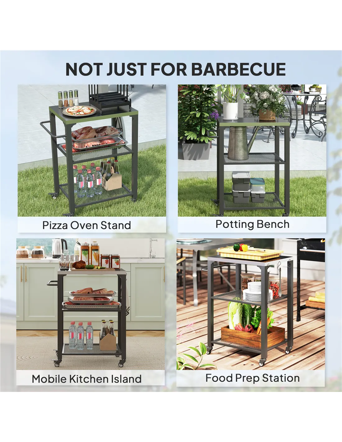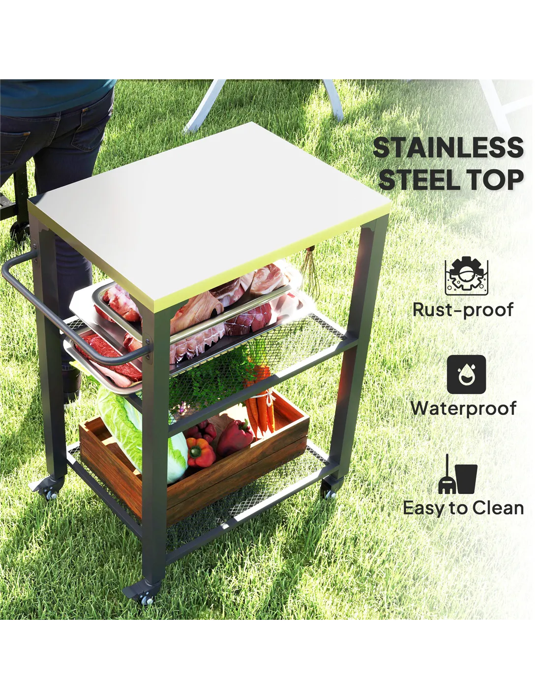 Outsunny Three-Shelf Outdoor Grill Cart with Stainless Steel Top, Outdoor Kitchen Island with 4 Wheels, 3 Hooks, Movable Food Prep Pizza Oven Table for Kitchen, Patio, Garden, 65.5 x 41 x 79 cm