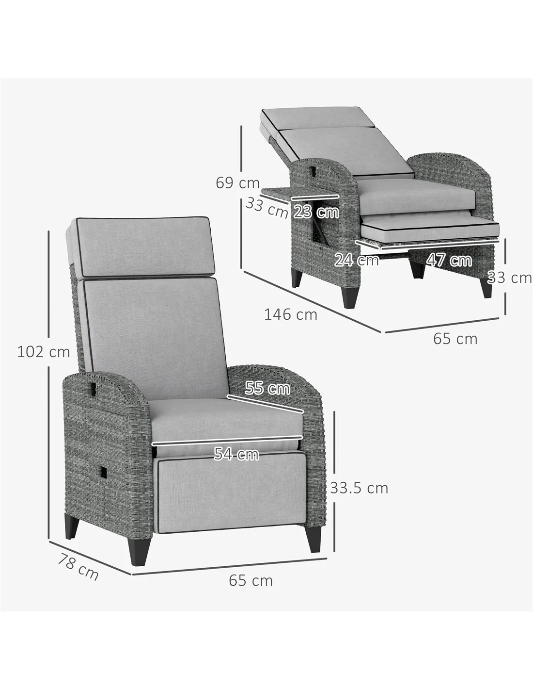 - Overall Dimension: 65W x 78D x 102H cm (upright), 146L x 65W x 69H cm (reclining)