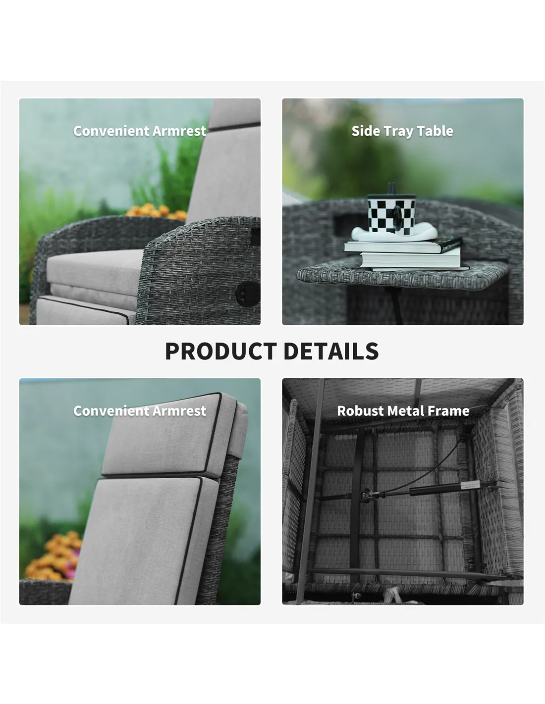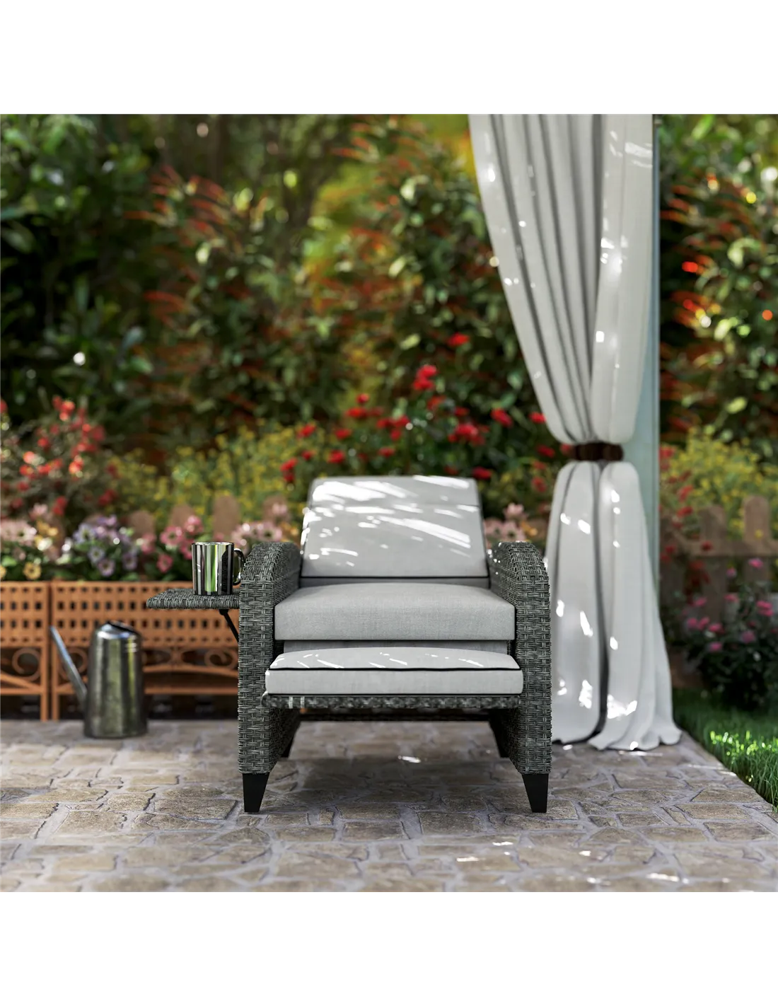 - Ideal for outdoor reading or enjoying a morning coffee, the lift-up side tray provides a convenient spot for drinks, snacks, or a book.