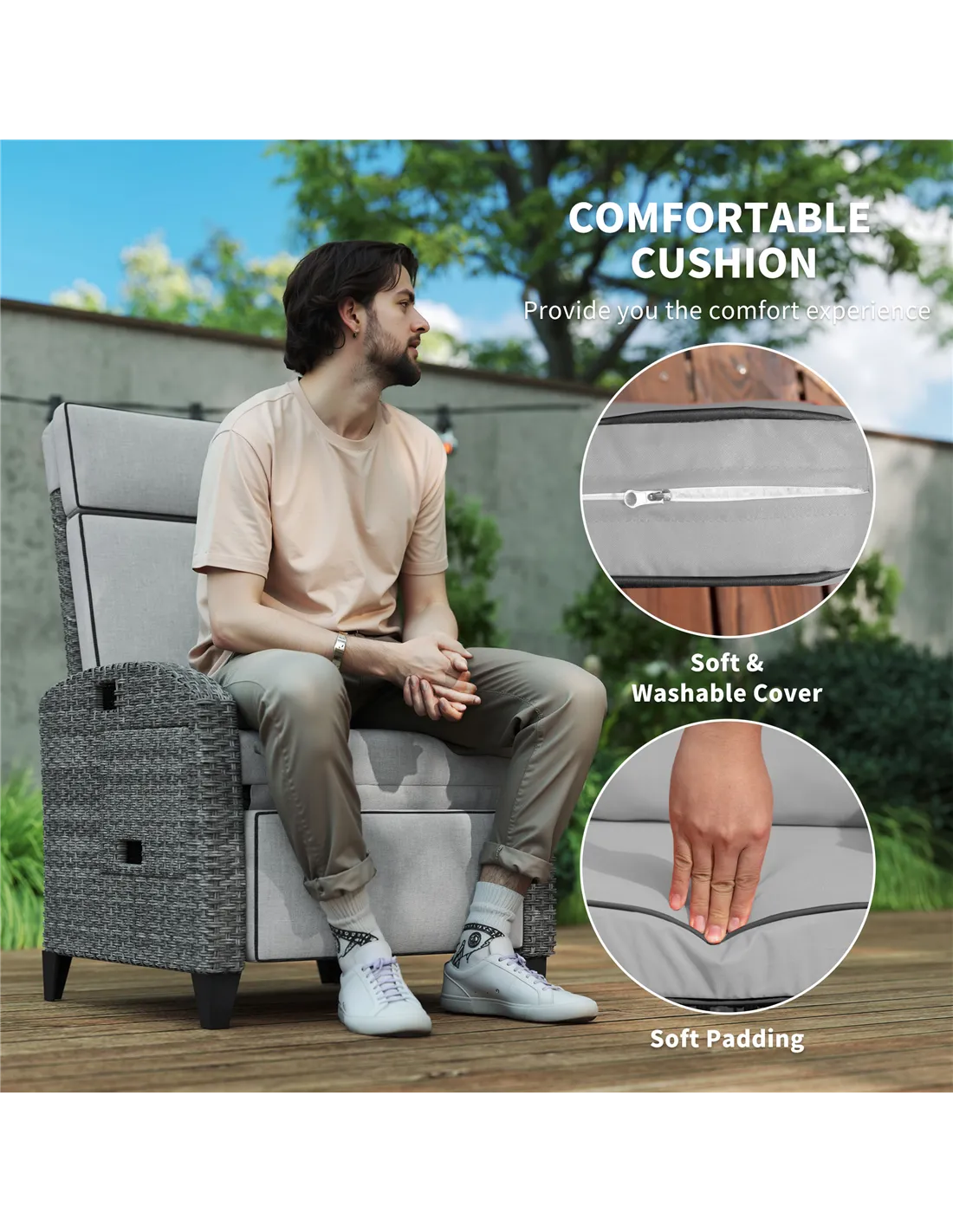 - Foam-filled cushions with zippers for easy cleaning and soft seating